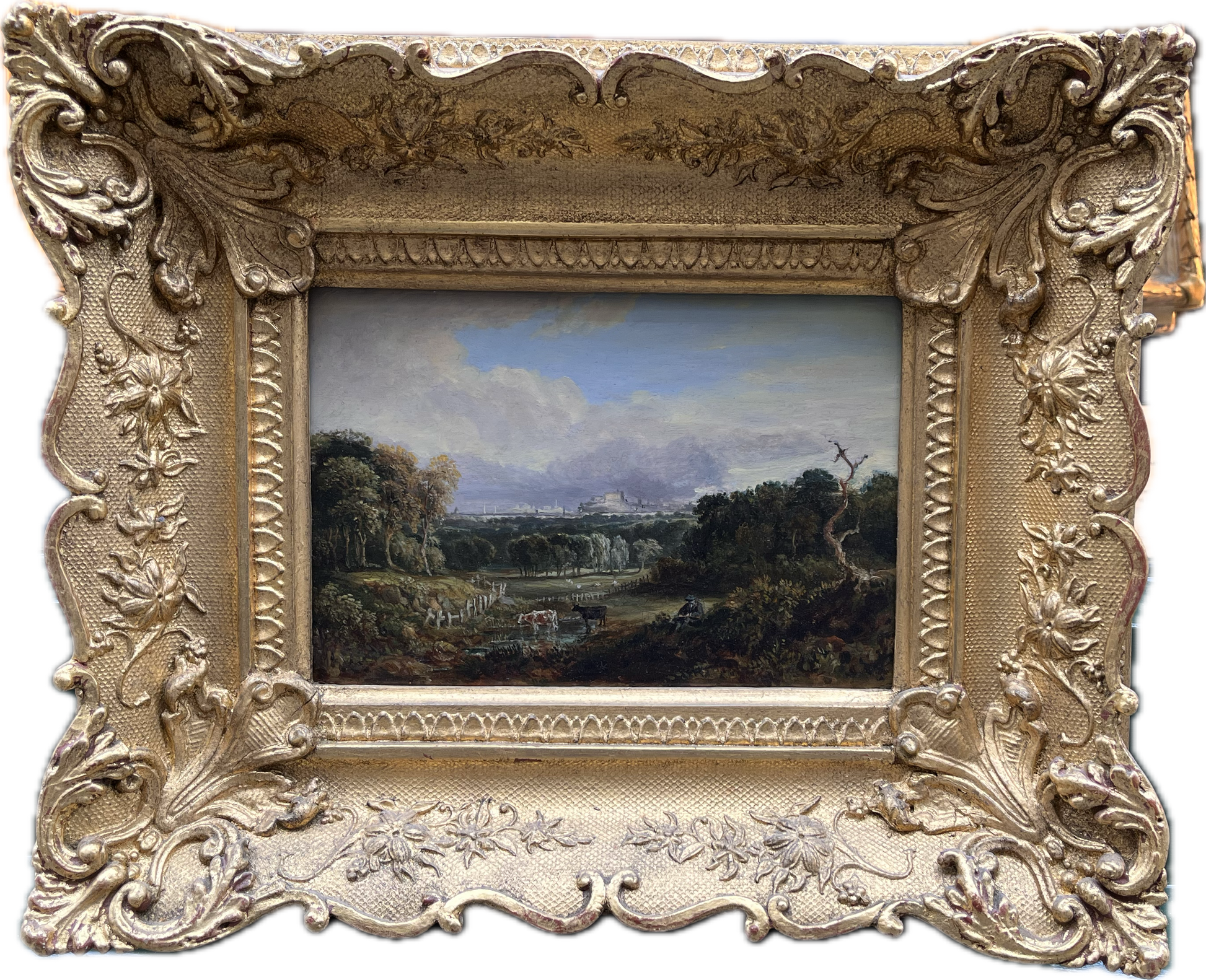 Nasmyth’s oeuvre is dominated by scenes of Scotland and Edinburgh, a subject matter that continued even after he moved to London in the early 19th century. As with his father, Nasmyth was heavily influenced by Dutch landscape masters, presumably having seen them on display at prominent London galleries. His landscape scenes were initially exhibited at the Royal Institution and the Scottish Academy Edinburgh from 1808, before receiving their debut at the Royal Academy and the British Institute in 1811, where they were immensely successful. Nasmyth was also one of the founding members of the Royal Society of British Artists. He was well known for his insistence on studying directly from nature, often embarking on painting expeditions with a small mobile tent that allowed him to keep working despite poor weather conditions.