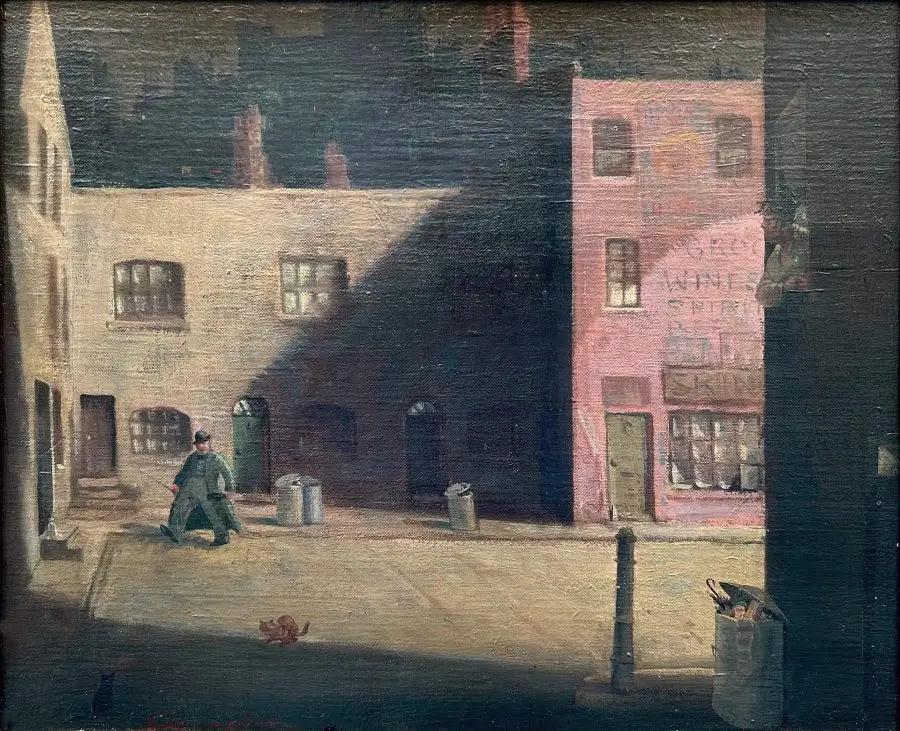 The artist has captured old London beautifully with the old bins, advertising on the walls and the cats bemused by the drunken figure. It sometimes takes an outsider such as Sancha to appreciate the beauty of the scene.