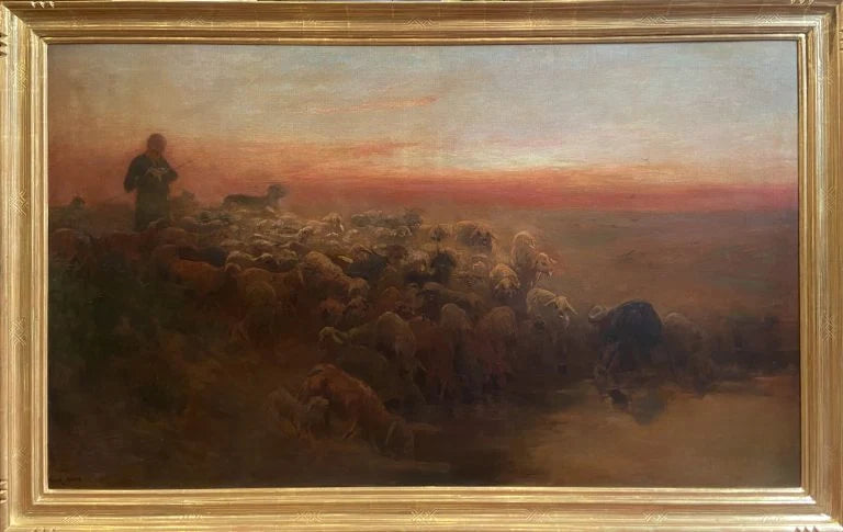 After repeated study journeys through Egypt, he produced numerous brilliant oil, watercolour and pastel studies of Egypt and the Sudan, mainly landscapes, street scenes and native studies. Amongst them were ‘A Son of the Sudan‘ 1895, ‘Crossing the Desert‘ 1900 and ‘Door of a Mosque at Cairo‘ 1905. He then travelled to India where he continued to paint prolifically, exhibiting the results in 1910 and 1911.