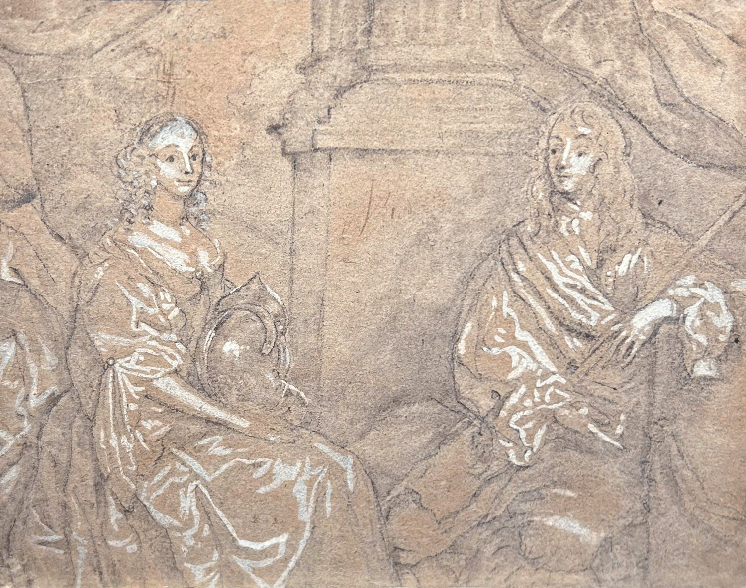 This drawing is based upon the double portrait by Sir Peter Lely’s of Anne Hyde, the Duchess of York, and James II, currently on view in the National Portrait Gallery. This sketch is fairly similar to the original composition, notably with both figures sat in the same positions. The use of white chalk by the artist effectively evokes the details and highlights found in the original.