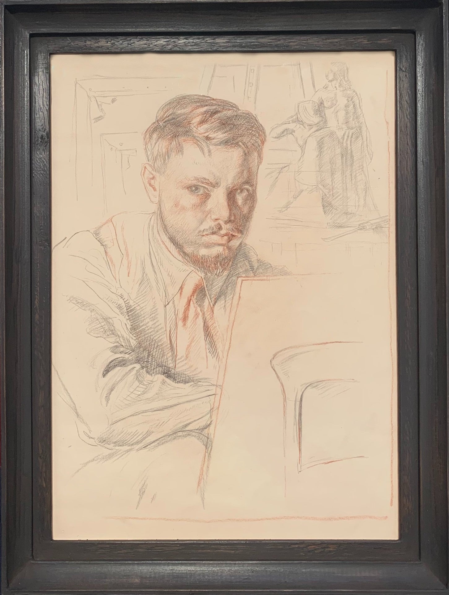 This imaginative self-portrait captures the artist at work in his studio, surrounded by sculptures and canvas stretchers. The artist presents a confrontational depiction of himself, as he portrays the perspective of the sitter.