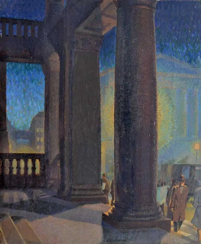 The painting depicts office workers in their overcoats and trilby hats, clutching their briefcases and newspapers, hurrying home past the Birmingham Art Gallery on a chilly winter evening. The Town Hall can be seen looming in the background of this bold painting, with the strong light from a streetlamp caught behind the column. The different colours of the sky are captured with a square brush in a rather pointillist manner.