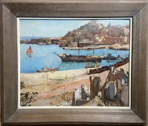 This painting stands out for its use of full-bodied brushstrokes and thick impasto application of paint. It depicts an Italian harbour in the 1940s, probably on one of the islands in the bay of Naples, such as Procida.