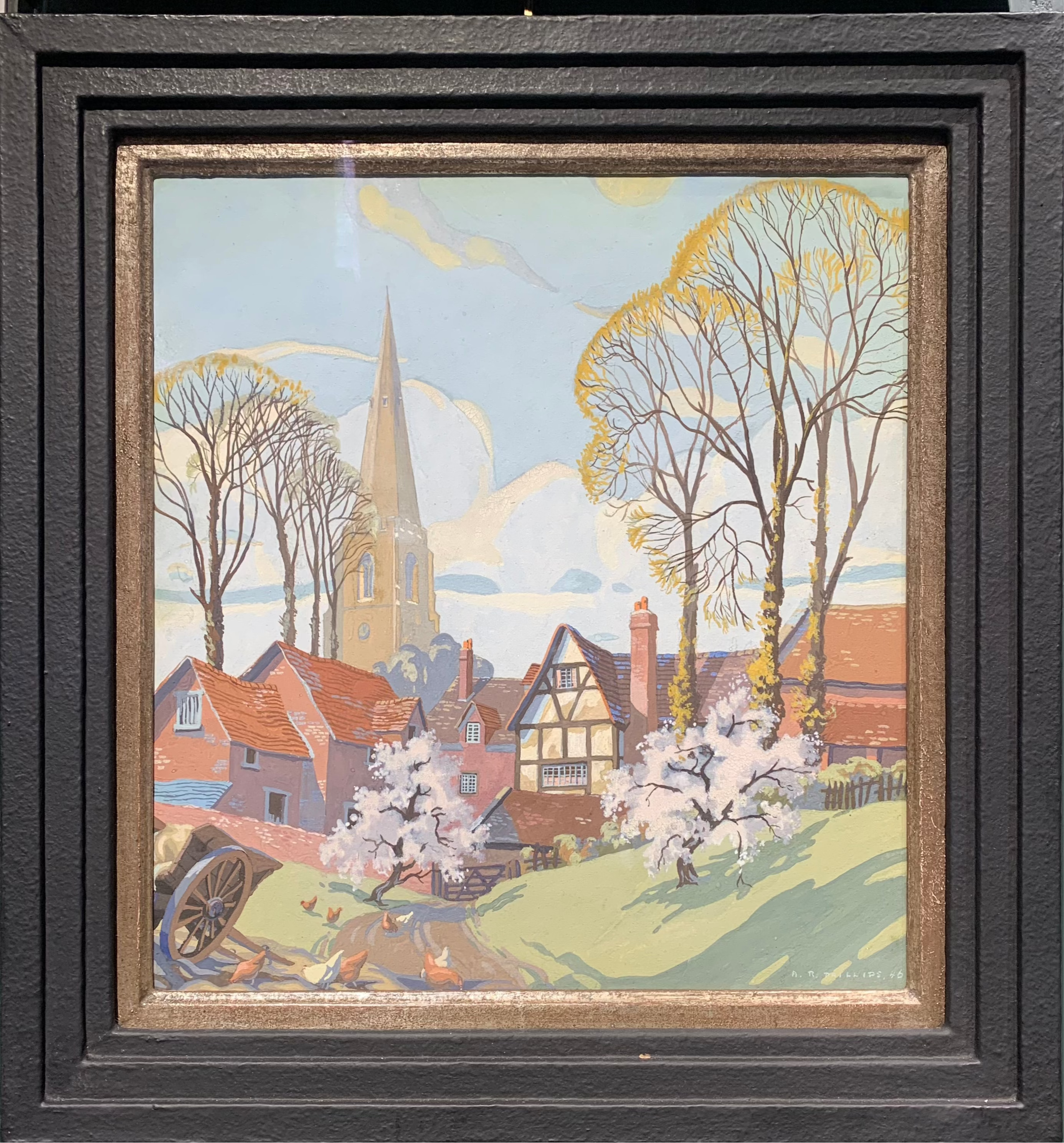 This painting, most likely created for a railway poster, captures the charm of a picturesque English village. The scene features traditional houses with red-tiled roofs and timber-framed structures, set against a backdrop of a prominent cathedral spire. The blooming trees and dirt path in the foreground, along with the chickens pecking at the ground, add to the idyllic and serene atmosphere. Framed by tall, leafless trees, the soft pastel colours evoke early spring.