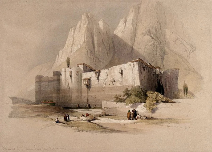 Roberts and his party arrived on the 18th of February and he noted in his journal: 'We were drawn up one by one, our elbows and knees receiving sundry thumps and bumps in the course of the ascent. We were ushered through a labyrinth of passages and staircases to the dormitories we were to occupy. The Superior received us in person with the greatest attention and kindness. A supper was soon provided of rice and dried dates and never did [a] poor pilgrim sleep more soundly than I under the hospitable roof of the monks of St Catherine. Roberts’s travelling companion, Kinnear, also described other comforts such as the excellent glass of arack, a smoking pilaf, and, for him, the greatest luxury, ‘the clear cool sparkling water from the convent well’.