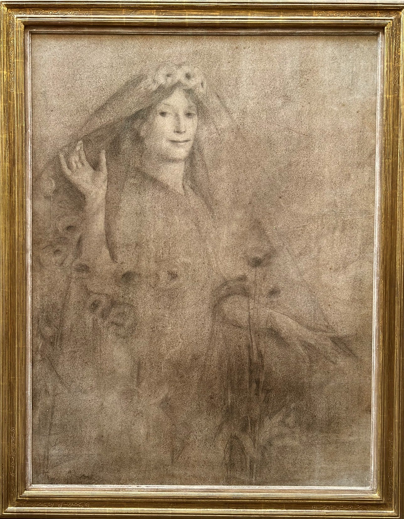 This work is a preliminary sketch for what many regarded to be Gotch's master work, 'Death the Bride'. The title of the painting comes from Shakespeare. It is from Measure for Measure, Act III, scene I, line 86, where Claudio says: 'If I must die, I will encounter darkness as a bride and hug it in my arms.' Gotch uses poppies here to show death personified as a beautiful, morbid bride ready to embrace the viewer for eternity.