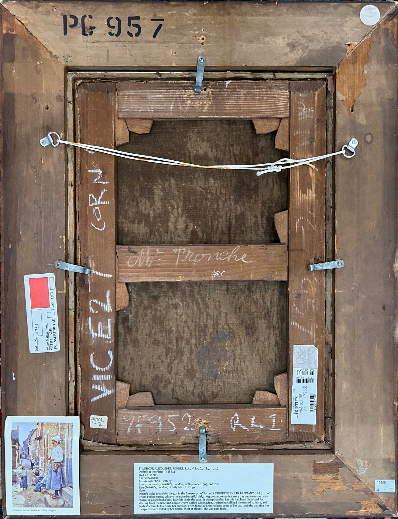 The model for the painting Desiree is the girl in the foreground of Forbes'A Street Scene in Brittany (1881) in the Walker Art Gallery, of whom Forbes wrote 'always the same beautiful girl, she grows more perfect every day and seems to be as charming as she looks but, I fear this is not the case' it transpired that Desiree had been dismissed for stealing from the hotel in Cancale where Forbes was staying. Desiree herself had threatened to leave and Forbes's attempts to ensure her constant attendance by keeping back some of her pay until the painting was completed were foiled by her refusal to sit at all until she was paid in full.