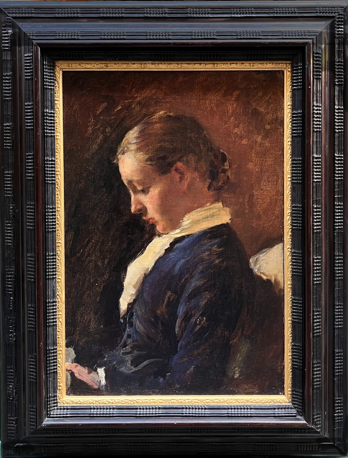 In this work, Desirée sits at a piano, head angled downwards to look toward the keys. Her dress is a sumptuous blue, punctuated by the bright white scarf around her neck. Her face is lit from the front, and the effects of this lighting are masterfully rendered - take, for example, the cheek facing the viewer being cast in shadow, as well as the shaded areas around her eyes and the reflection of light upon her silky hair.