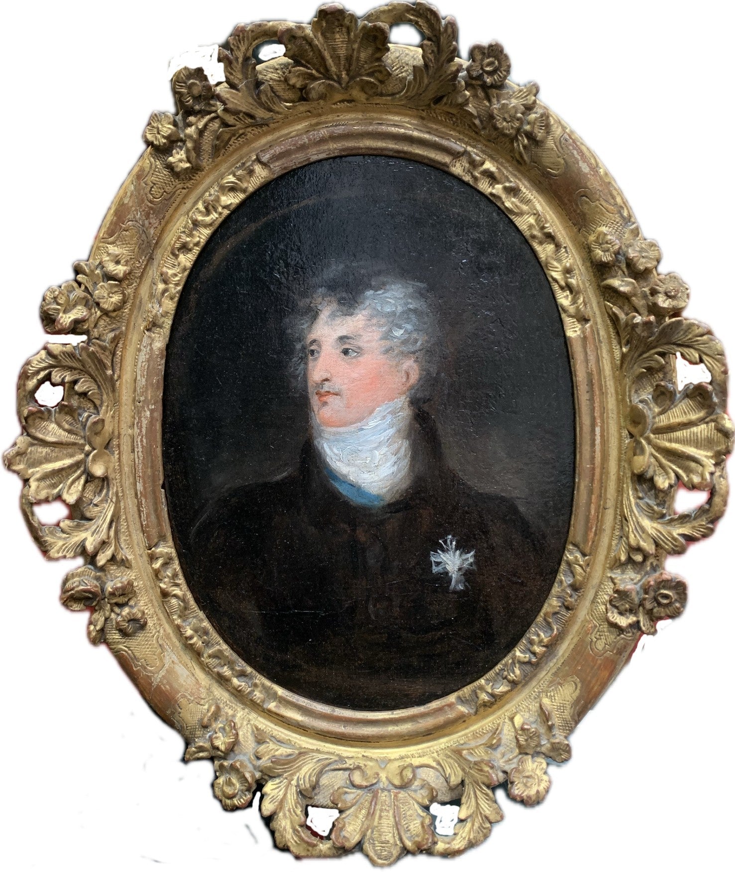 This painting is a copy of Thomas Lawrence’s 1822 portrait of Armand Emmanuel du Plessis, Duke of Richelieu. As with the original portrait, this painting shows the Duke sporting the blue sash and medallion of the French Order of the Holy Spirit, the most prestigious chivalric order in France at the time. The viewer is just about able to make out the medallion’s dove symbol, and it is clear that the artist who copied the original portrait was dedicating his time to rendering the Duke’s face and hair. The grey curls, long nose and downturned mouth are diligent representations of Lawrence’s work, indicating the portraitist’s skill at rendering faces.