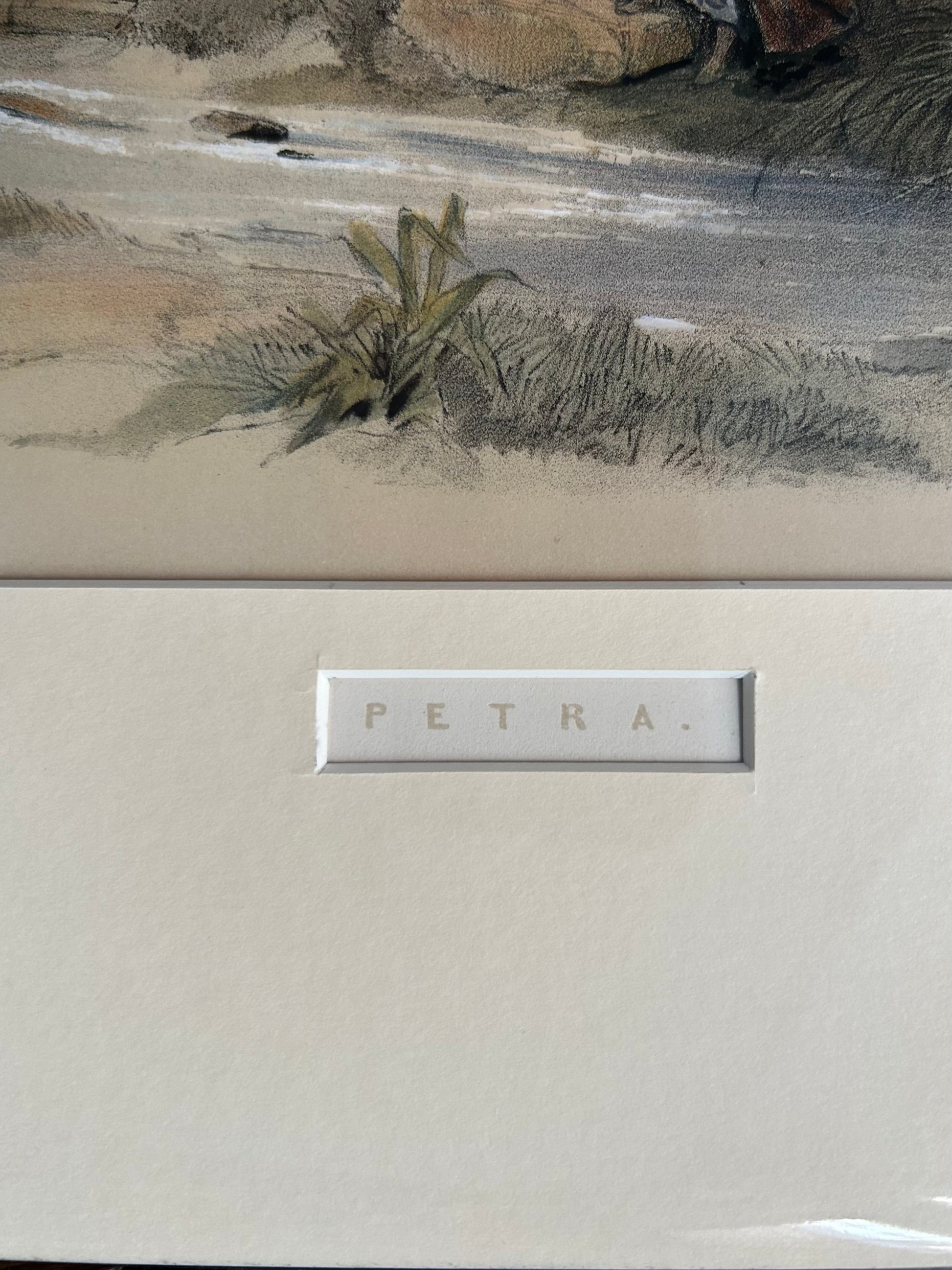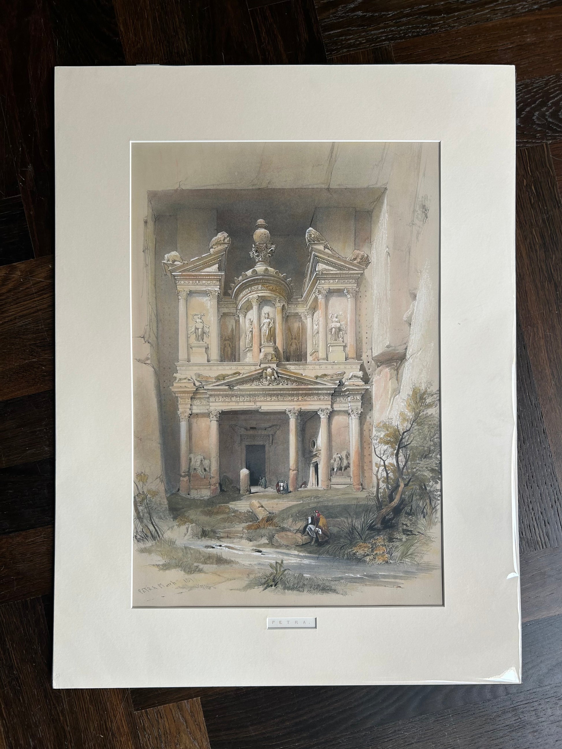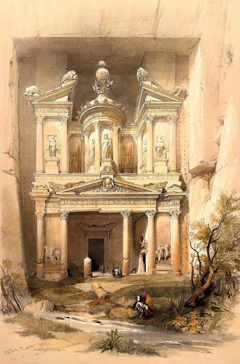 This lithograph shows the beautiful Hellenistic facade of El Khasne (the Treasury) which was carved out of the rock to serve as a tomb for the Nabataean King Aretas III (who ruled from 84 to circa 59 BC) but derives its name from the legend that an Egyptian pharaoh hid his treasure here.
