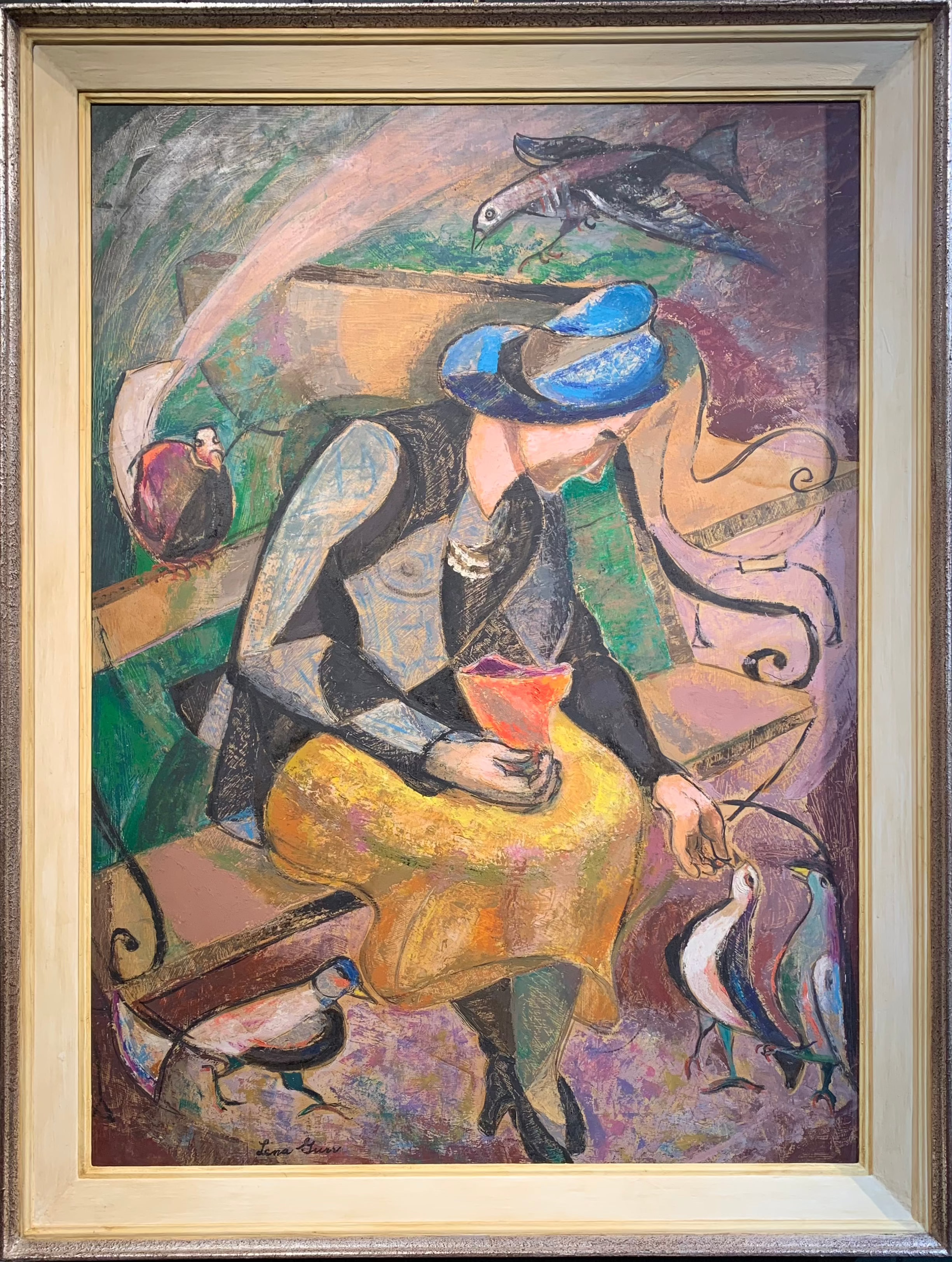 Here we see a smartly dressed woman sat on a park bench, feeding a group of pigeons that surround her. Lena Gurr had a prolific career in which she painted landscape scenes and still lifes but her most noted works are ones such as these, showing everyday city scenes that were laced with social commentary. Indeed, Gurr noted that her artwork always aimed to show “the joys and sorrows of everyday life.”