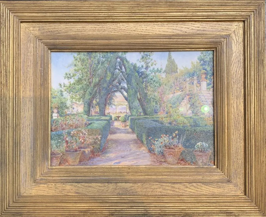Rowe was a watercolourist specialising in garden scenes. He spent his career responding to the Victorian love of formal gardens with his meticulous paintings of the grounds of the country’s finest historic houses. Ernest Arthur Rowe was born in West Ham, which was then in Essex. He trained first as a lithographer and, in 1884, began studying at the Royal Institute of Painters in Water Colours where he won a President’s Medal in 1885.