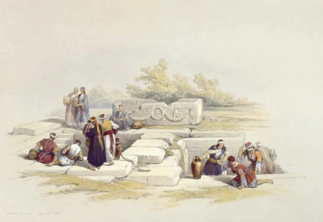 In this lithograph, Roberts depicts the fountain being used for its original purpose, with both men and women in the process of collecting water for their homes.