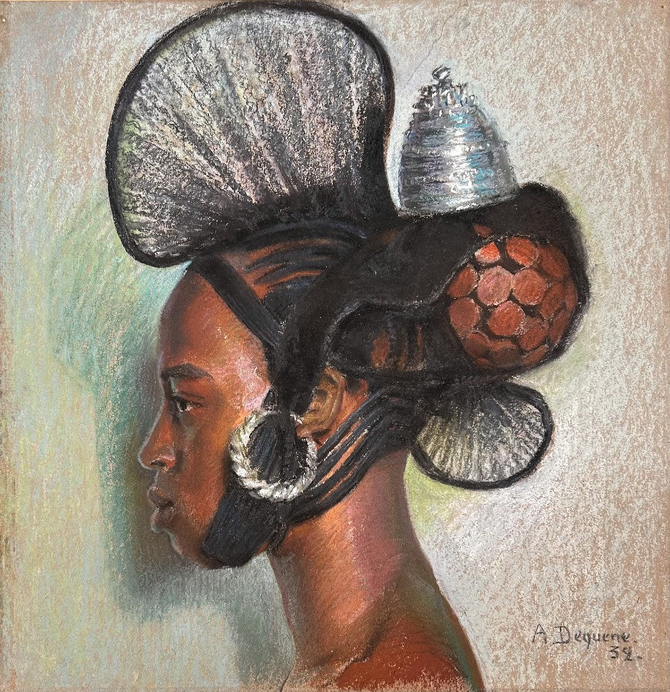 Dequene studied art in Lille where he was born and in Paris. A study grant allowed him to spend five months in French Sudan, Upper-Volta, French Guinea and Senegal in 1932. He exhibited his African oils and pastels at the Salon de Société Coloniale des Artistes Francaise in 1933. He visited Morocco and Madagascar in 1946 and 1953 respectively. His painting of the market in Fez is in the collection of the Musée d’Art et d’Industrie in Roubaix. From 1936 to 1962 he was a professor of painting and drawing in the same city. Retrospective exhibitions of his work were held in France in the 1990s.