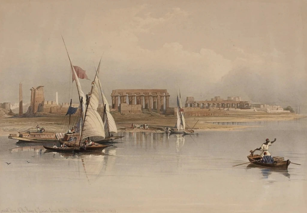 Atmospheric view from the River Nile of the Temple and ancient remains at Luxor in Upper (southern) Egypt. The boats in picture were probably the ones that carried David Roberts and his team along the Nile.