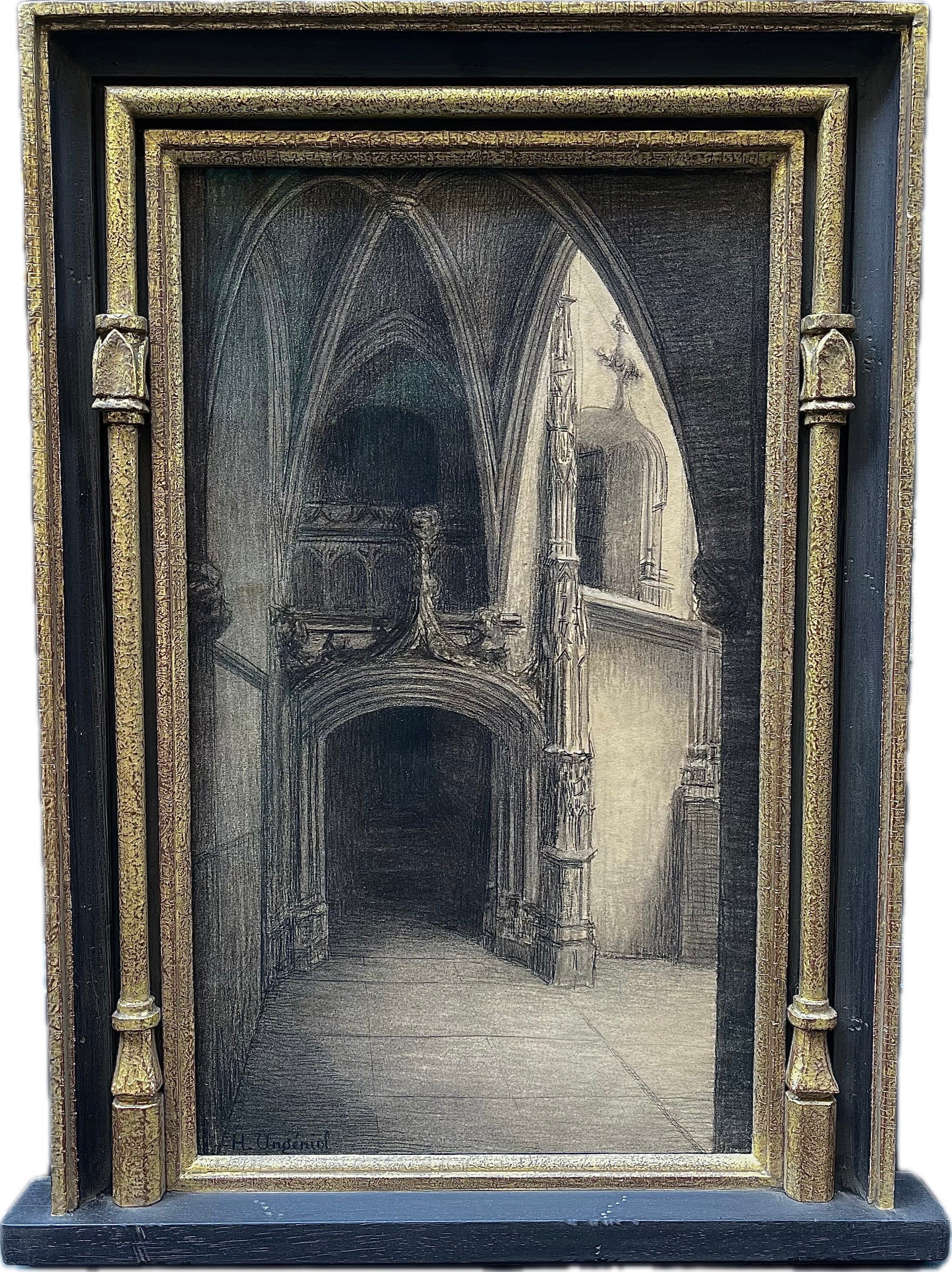 In this drawing, Angenoil depicts the gothic architecture of an ecclesiastical building. The focus on light and shadow creates a stunning atmosphere, especially in relation to the archway leading off into an unlit corridor. The stoic and angular corners of the architecture exemplifies Angéniol's desire to capture the serene, inner life of contemporary France, contrasting sharply with the work of his contemporaries, such as the impressionists.