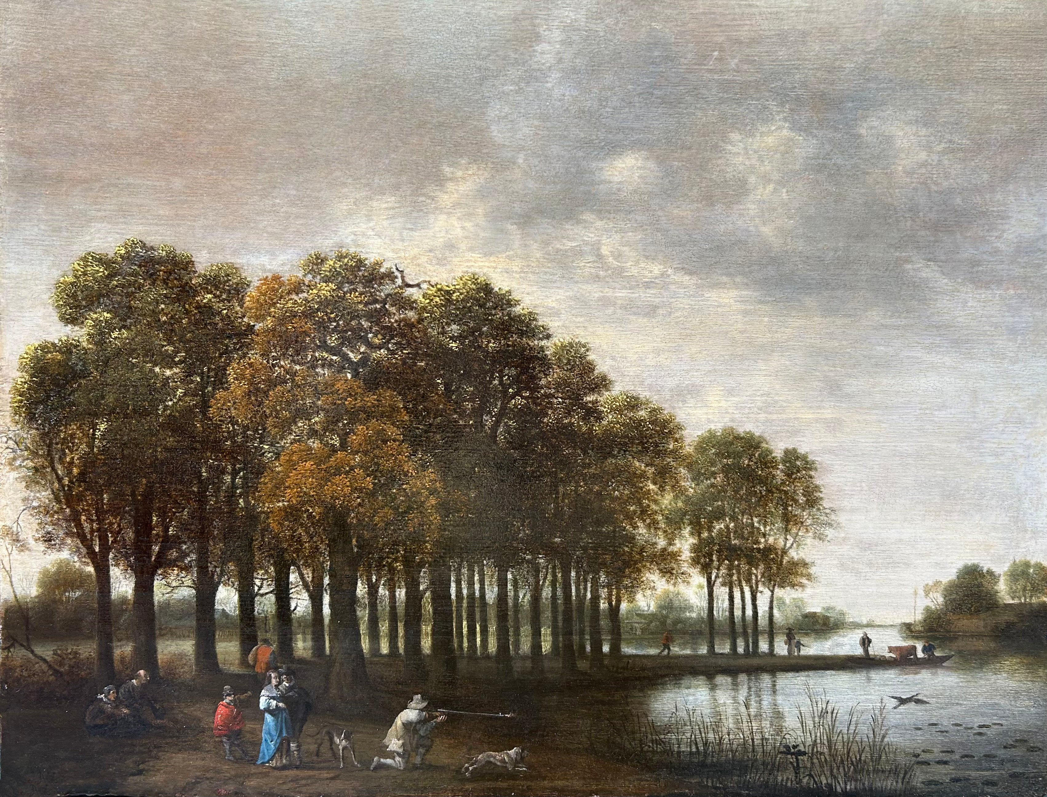 In this landscape, a heron shoot is taking place. Amongst the figures, we see a wealthy couple in fine drapery observing a hunter lining up his shot on a newly startled heron. A retriever dog rushes towards the heron, eagerly awaiting the opportunity to return the quarry to the hunter. The couple’s entourage surrounds them, whilst farmers can be seen with their cattle in the background.
