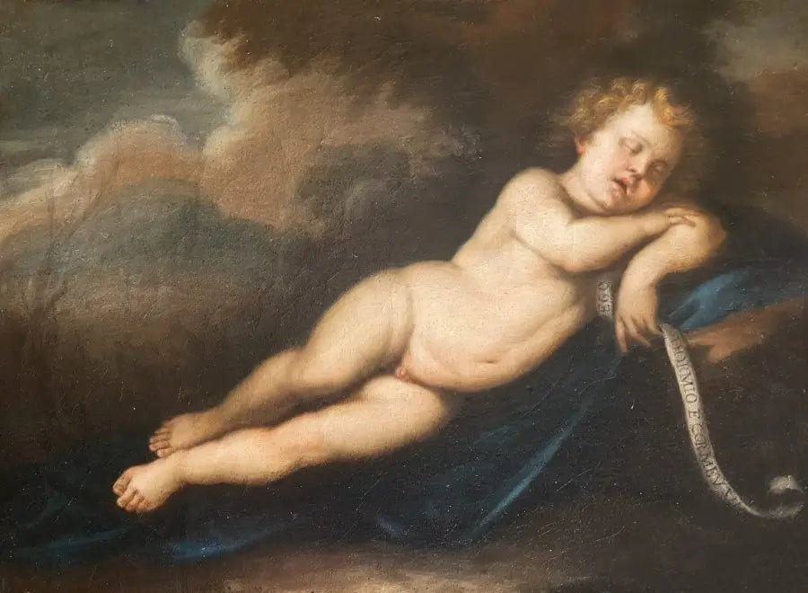 Here, we see a sleeping putti lying underneath a set of trees, holding a ribbon. The text that can be seen on the scroll is from the Song of Solomon, chapter five, verse two; ‘ I sleep, but my heart waketh: it is the voice of my beloved that knocketh, saying, Open to me, my sister, my love, my dove, my undefiled: for my head is filled with dew, and my locks with the drops of the night’.