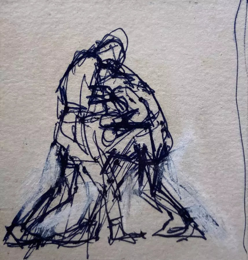 Little of Rabin’s work from before his time at Goldsmith’s College survived his critical destruction and an accidental destruction by a wartime landlady. Much of what exists are figure studies prepared as demonstrations for students and coloured boxing scenes produced with thickly applied wax crayons of his own making.