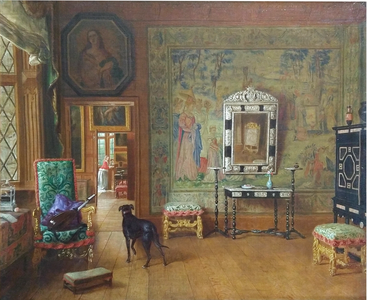 The majority of the canvas is given to a well furnished drawing room resplendent with various paintings, tapestries and furniture. To this day Knole House has one of the finest collections of 17th century English upholstered furniture in the world. Much of it was made for the royal palaces of the ruling Stuart dynasty and is of the highest quality. It is likely that the chair and footstools seen her originally came to Knole house as part of the vast collection put together by Charles, 6th Earl of Dorset.