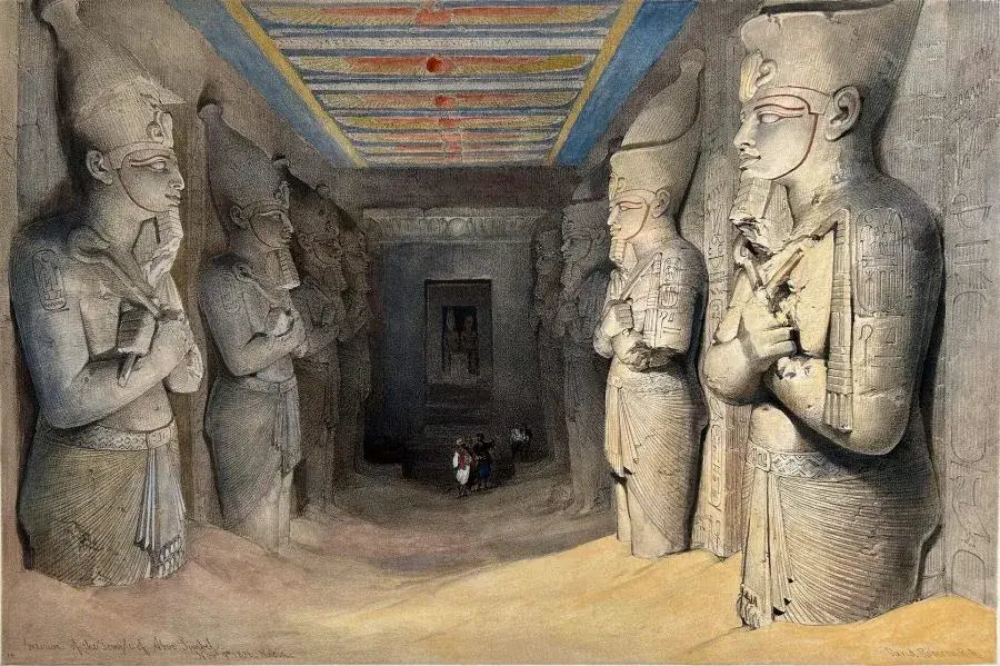The interior of the temple is 154 feet long by 52 broad (exclusive of the side chambers). It is comprised of fourteen separate rooms. Eight standing figures of Pharaoh Ramesses, 30 feet high, ornament the outer hall. They are as well proportioned as they are highly finished. The drapery of these statues reaches nearly half-way down to their knees, and is striped like that of the figures outside. The features of the countenances are perfect, and they all have the hook and scourge (the usual emblems of Pharaoh) in their hands, which are crossed on the chest.