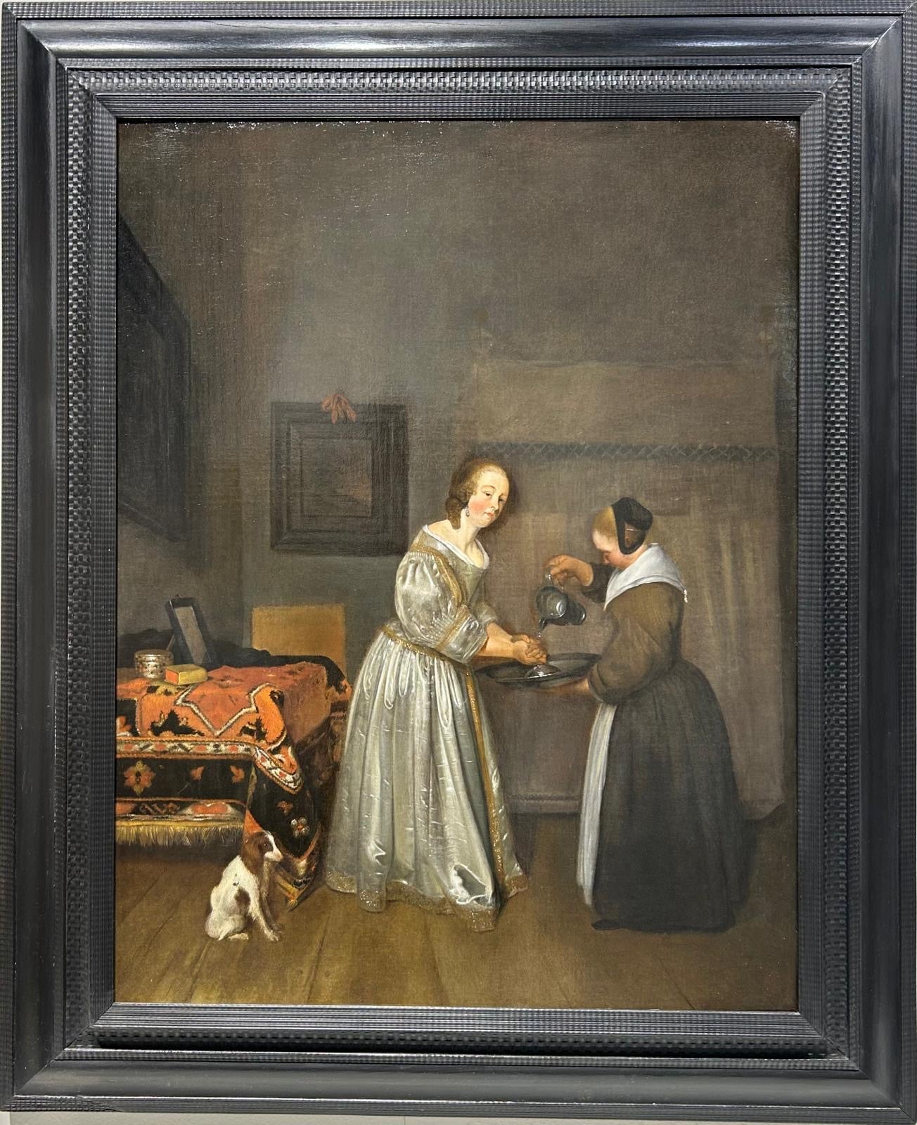 In this genre painting by Ter Borch, the central woman is composed facing the viewer in a grey satin dress as she is assisted by her maid, who using a pitcher and a bowl washes her hands. Next to her a small Cavalier King Charles Spaniel sits just behind a dressing table. The inclusion of domestic objects, such as the bed and the jug creates a sense of familiarity that Ter Borch is acclaimed for.