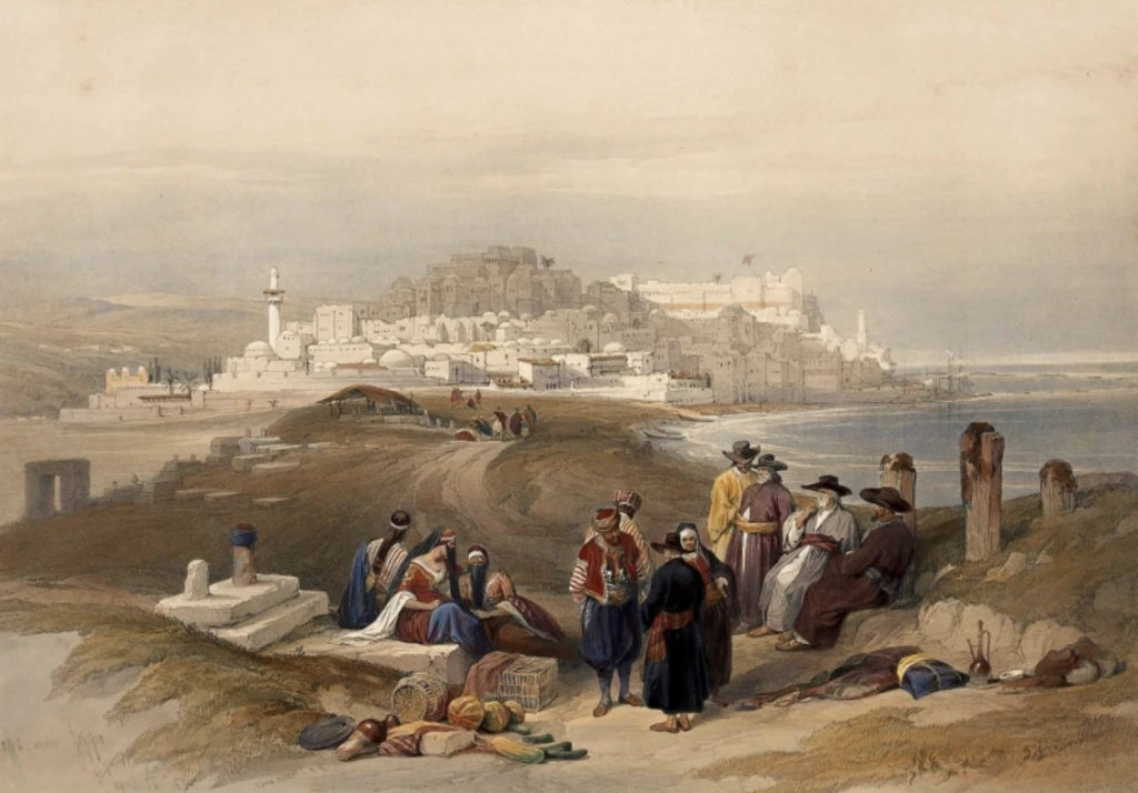 The town’s position and proximity to the sea is well represented in Roberts’s lithograph and he successfully makes reference to Jaffa’s importance as a centre for trade - it was celebrated for the manufacture of soap and its production of water-melons – by including a large group of both European and local figures in the foreground.
