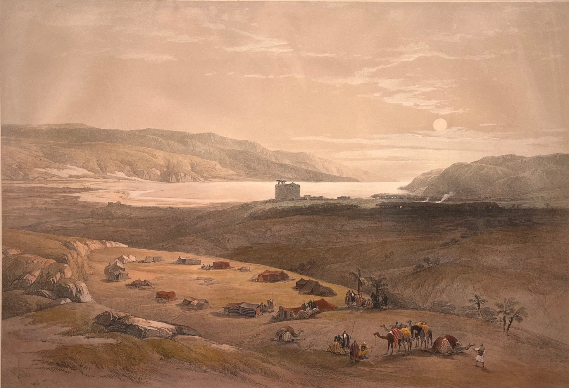 This lithograph shows this encampment under a clear, moonlit sky. The entire composition consists of graceful curves and conjures up the magic stillness of the desert night. Roberts was very much struck with the breadth of the plain of Jericho and here, as is so often the case, he succeeds in capturing the grandeur of the landscape before him.