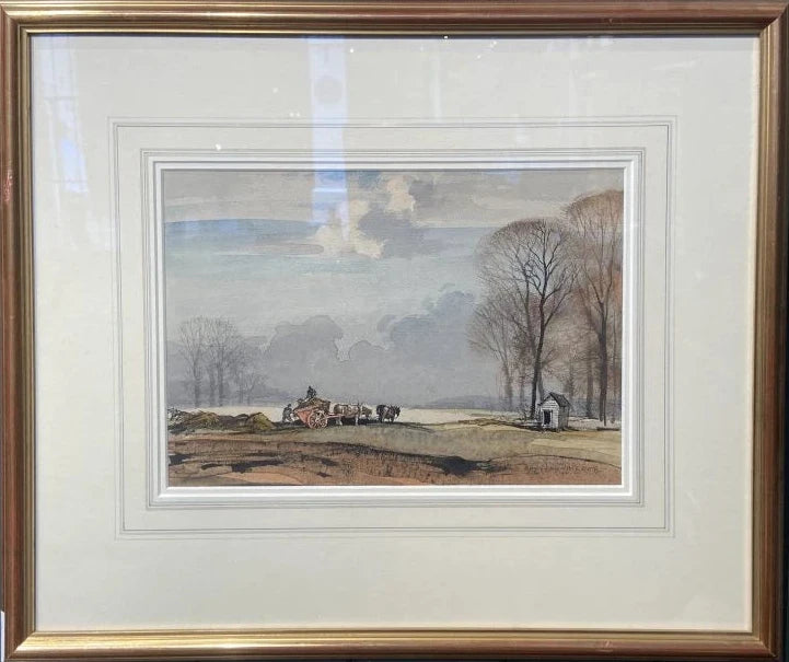 Working as an illustrator from 1925, Hilder had his status boosted a decade later, in 1935, when he took the place of Sullivan at Goldsmiths’ College. In the same year, he established his reputation as a watercolour painter of British landscapes with his first solo show at the Fine Art Society. He also exhibited at the Royal Academy of Arts and other London venues and, in 1938, was elected to the membership of the Royal Institute of Painters in Water-Colours (RI). During the Second World War, he worked first as a camouflage officer and, later, as an artist in the Central Office of Information.