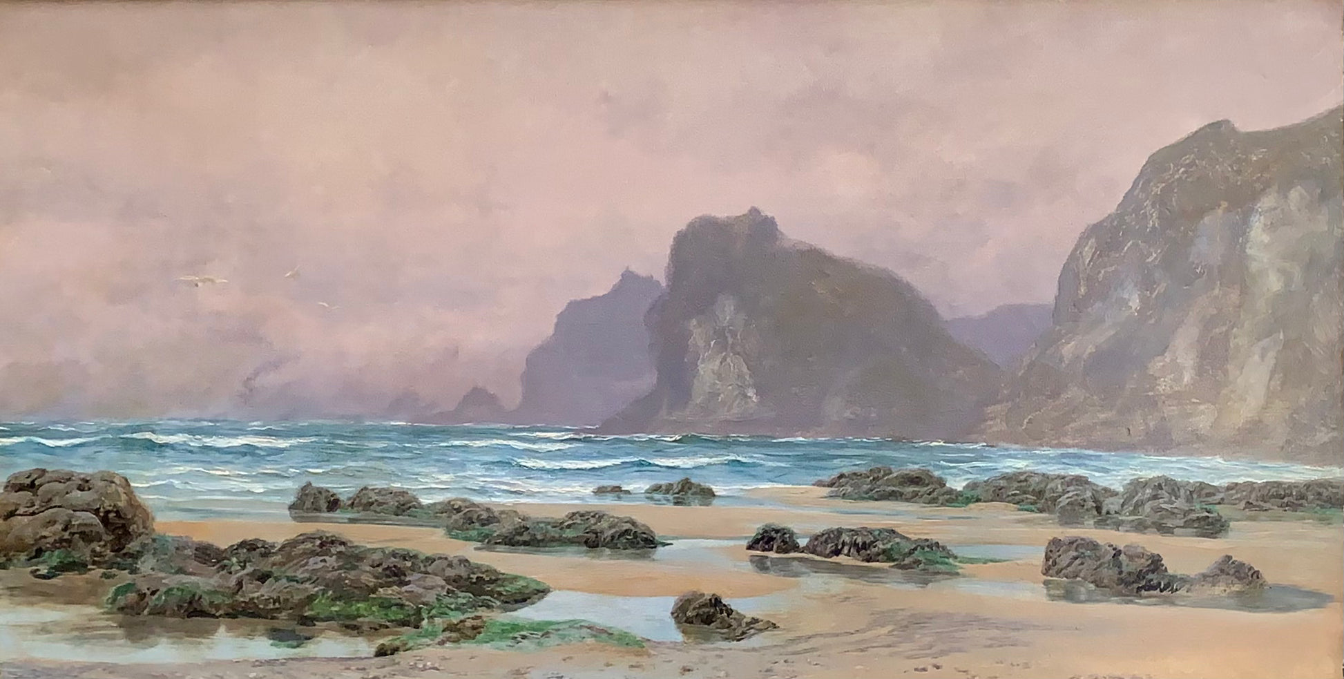 In this captivating landscape painting, Brett masterfully captures a cloudy sunrise over Kynance Cove, situated on the eastern side of Mount’s Bay in Cornwall. The small, crashing waves and shimmering pools of water evoke a crisp, invigorating morning, with the distant cliffs looming majestically over the water’s edge. The wet sands and moss-covered rocks scattered across the beach extend the shoreline, drawing it towards the viewer, stretching it across the foreground. The subtle portrayal of seagulls soaring through the clouds further enhances the windy ambiance of the scene as they are depicted scattered within their flock.