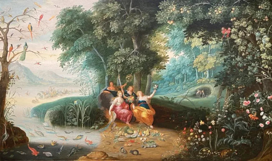 In this painting four seated women representing Water, Air, Earth, and Fire are surrounded by a lush landscape.