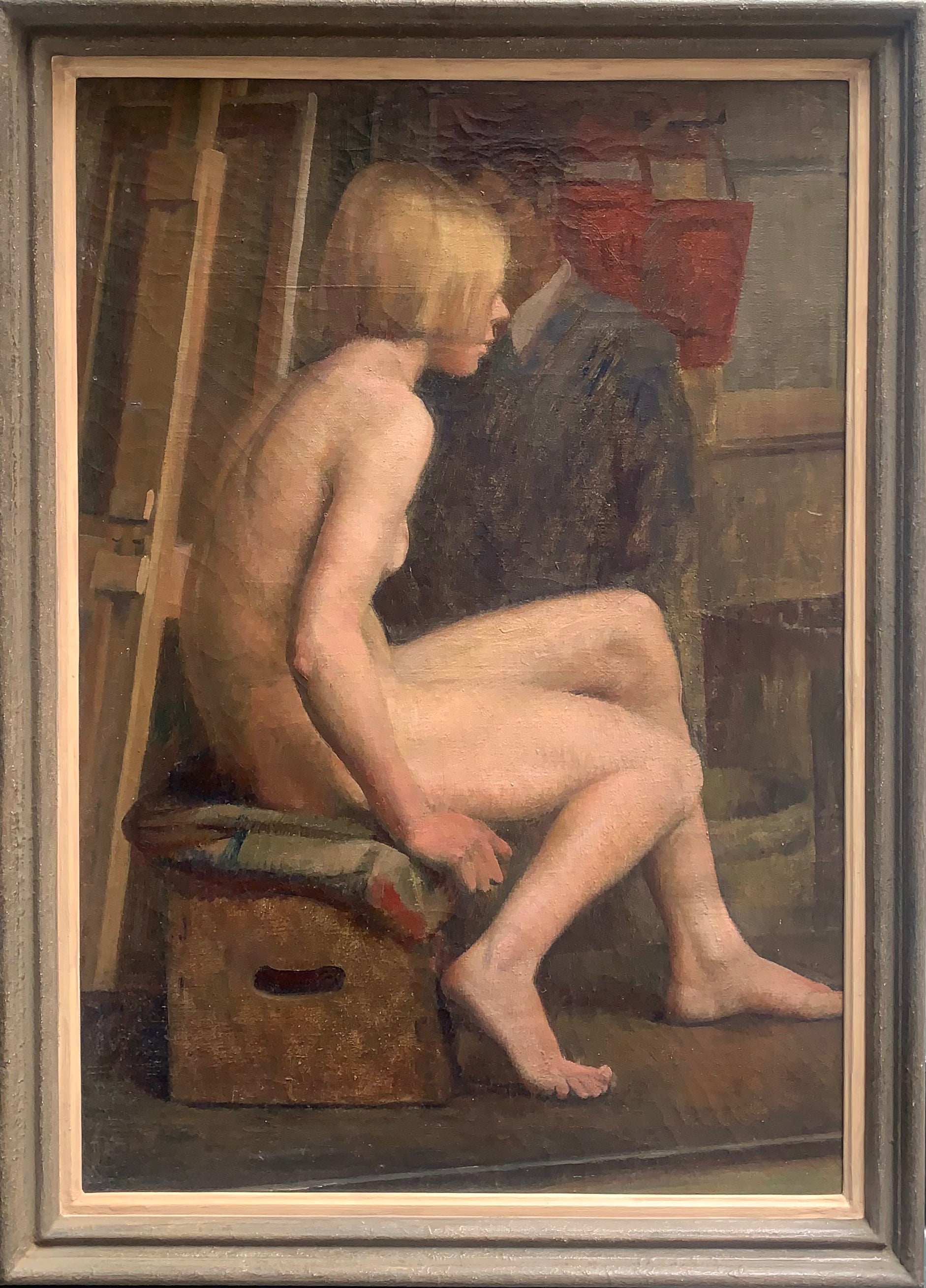 In this painting the seated nude life drawing model is captured from the side. Depicted within the class, Woollatt captures an art student behind the model, working on a canvas that inadvertently reflects what is happening behind our own perspective. The figure, sitting almost uncomfortably on her wooden box, is depicted by Woollatt as both innocent and powerful, hunched over but with a firm positioning of her legs as though she is ready to spring upwards.