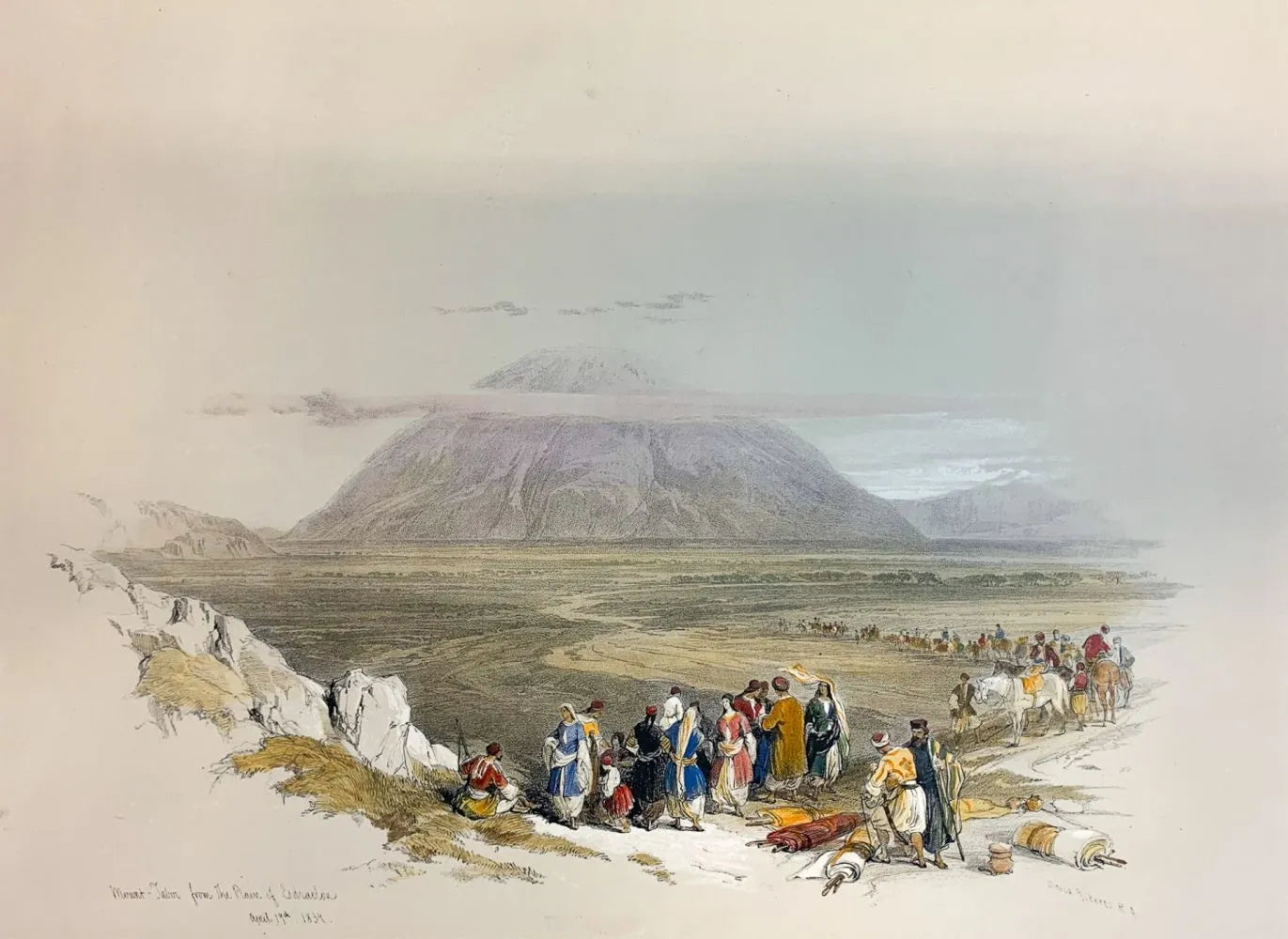 This lithograph is based on a sketch made by Roberts made on the 19th of April 1839 when en route to Nazareth. The summit of Mount Tabor (Jebel-el-Tur) stands at over a thousand feet above the plains of Esdraelon to the south-east of Nazareth.