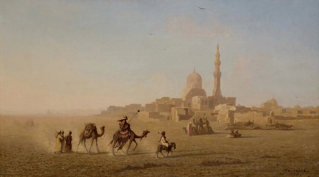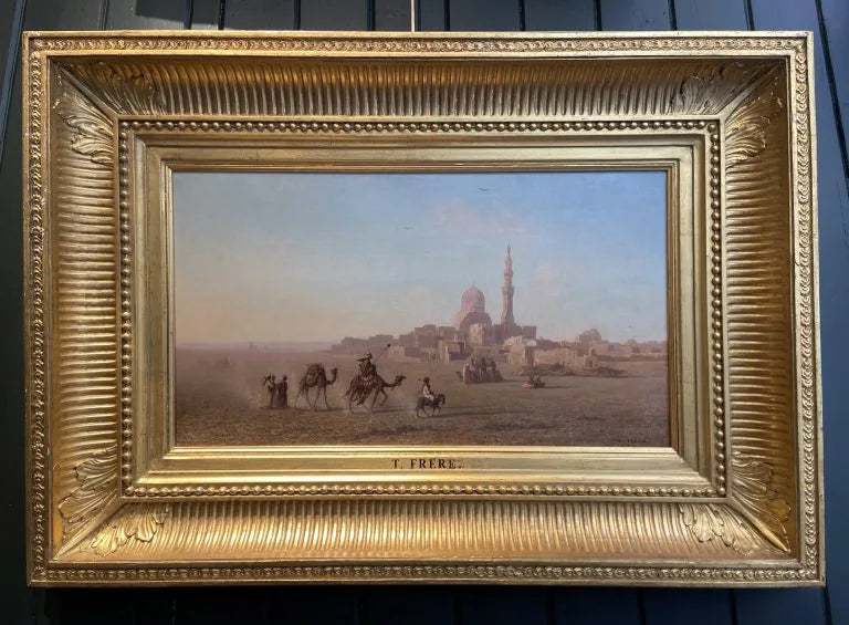 A visit to Algeria in 1837 changed the course of his life. He exhibited his first Orientalist painting at the Salon in 1839 and from then on painted only scenes of the Muslim world. He stayed in Algeria for a year, painting several large pictures, which were later bought by King Wurttemberg. He appears to have travelled almost annually to Algeria until about 1850. In 1851 he journeyed further East, stopping at Malta, Greece and Smyrna on his way to Constantinople where he stayed for eighteen months. He then went on to Syria, Palestine, Nubia and Egypt, where he had a studio in Cairo. After three years travelling Frère returned to Paris laden with material for future paintings. He took part in the Paris Universal Exhibitions of 1855, 1867 and 1878. He made his last journey to Egypt in 1869 for the inauguration of the Suez Canal in the company of Empress Eugénie and her entourage.