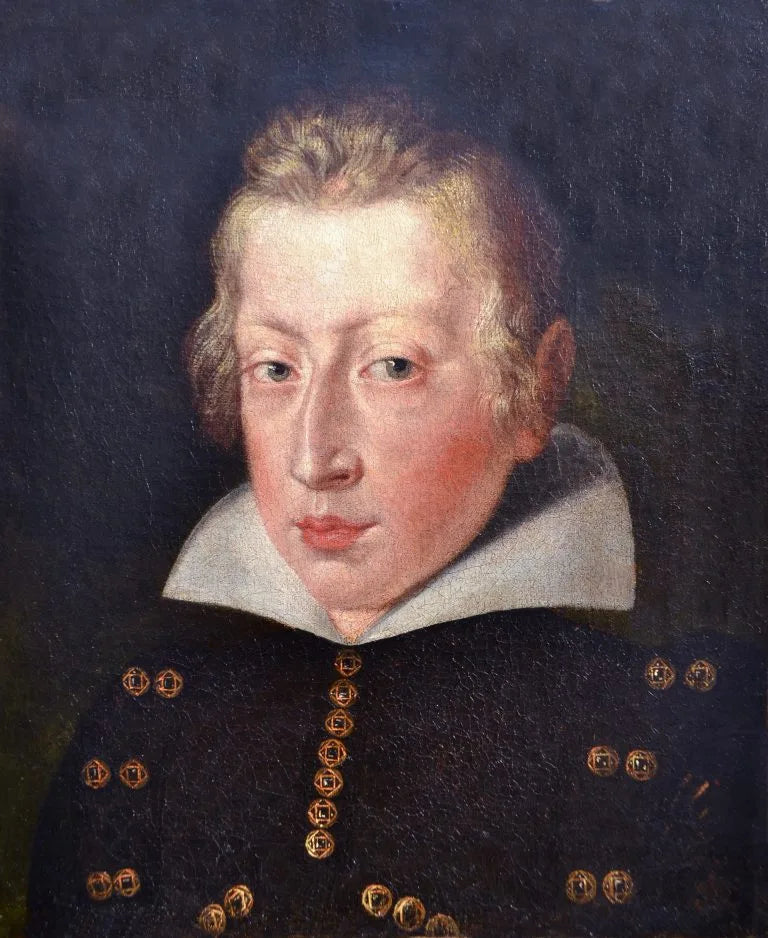 The artist has depicted his sitter with great sensitivity, delicately observing the transition of flesh tones his flushed pink cheeks and picking out the wisps of hair around his ears with fine brush strokes. The dramatic play of light and shadow serves to emphasize both the sitter’s face and the gold buttons decorating his doublet, as they shine out against the dark background.