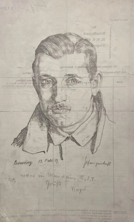 This is a portrait of a German airman that was done by the artist at the start of 1919. The artwork has been created on the reverse of a document from Adlershof, a German Air Park. This exact document is from the ‘Airman Replacement Department’ and is a request form for replacement parts for aircrafts – it asks the writer to specify the type and number of aircrafts, the type of engine and details of its propellers.
