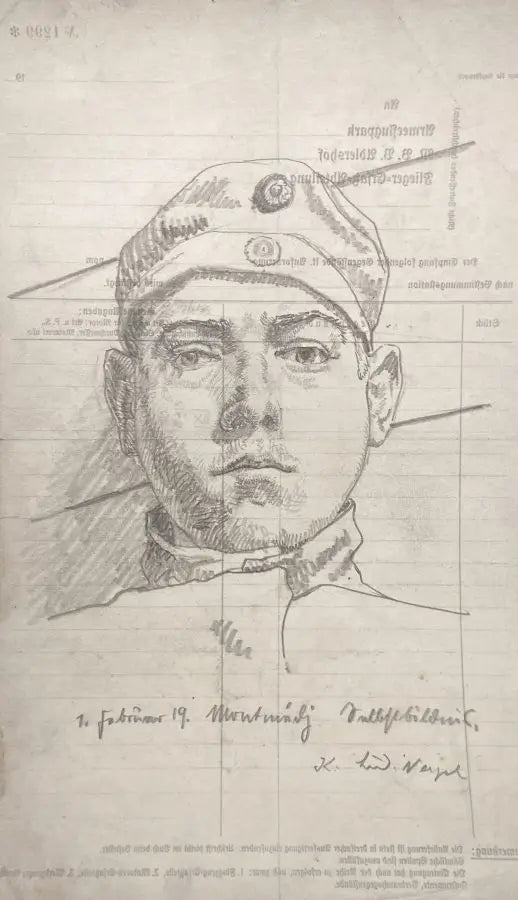 This is a portrait of a German airman that was done by the artist at the start of 1919. The artwork has been created on the reverse of a document from Adlershof, a German Air Park. This exact document is from the ‘Airman Replacement Department’ and is a request form for replacement parts for aircrafts – it asks the writer to specify the type and number of aircrafts, the type of engine and details of its propellers.