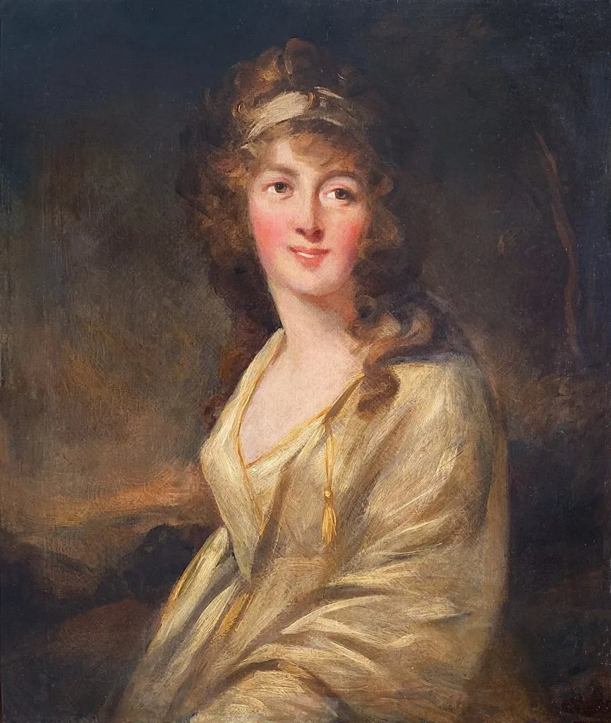 This portrait is marked by its loose brushwork, which creates a sense of hazy nostalgia. Despite the loose strokes, the level of detail in this portrait is readily apparent. The sitter’s cheeks are bright and rosy, and the smile that plays on her lips also causes her eyes to crease slightly. Her soft curls, rendered in brown and auburn tones, are styled with a headband that pulls her hair away from her face and lets it cascade down her shoulders. The lady wears a yellow dress with gold trims reminiscent of Classical Greek clothing, with the folds and texture of the dress beautifully rendered by the artist. There is an elegance to the sitter, as well as a sense of playfulness and joy.
