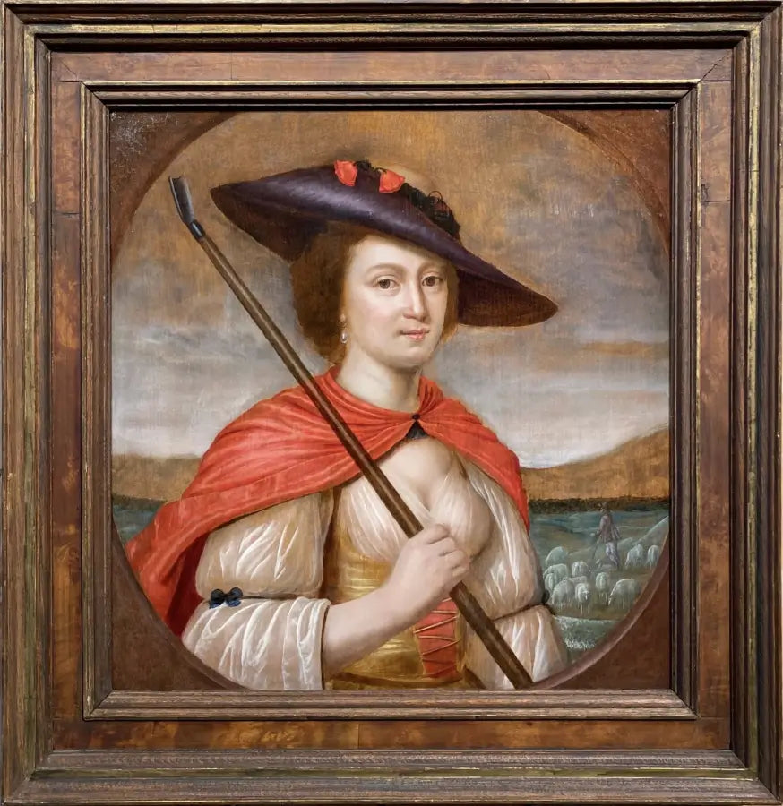 This painting is a half-length portrait of a lady in the guise of a shepherdess. She is holding a houlette (or a baton de berger), the traditional attribute of a shepherd or shepherdess.