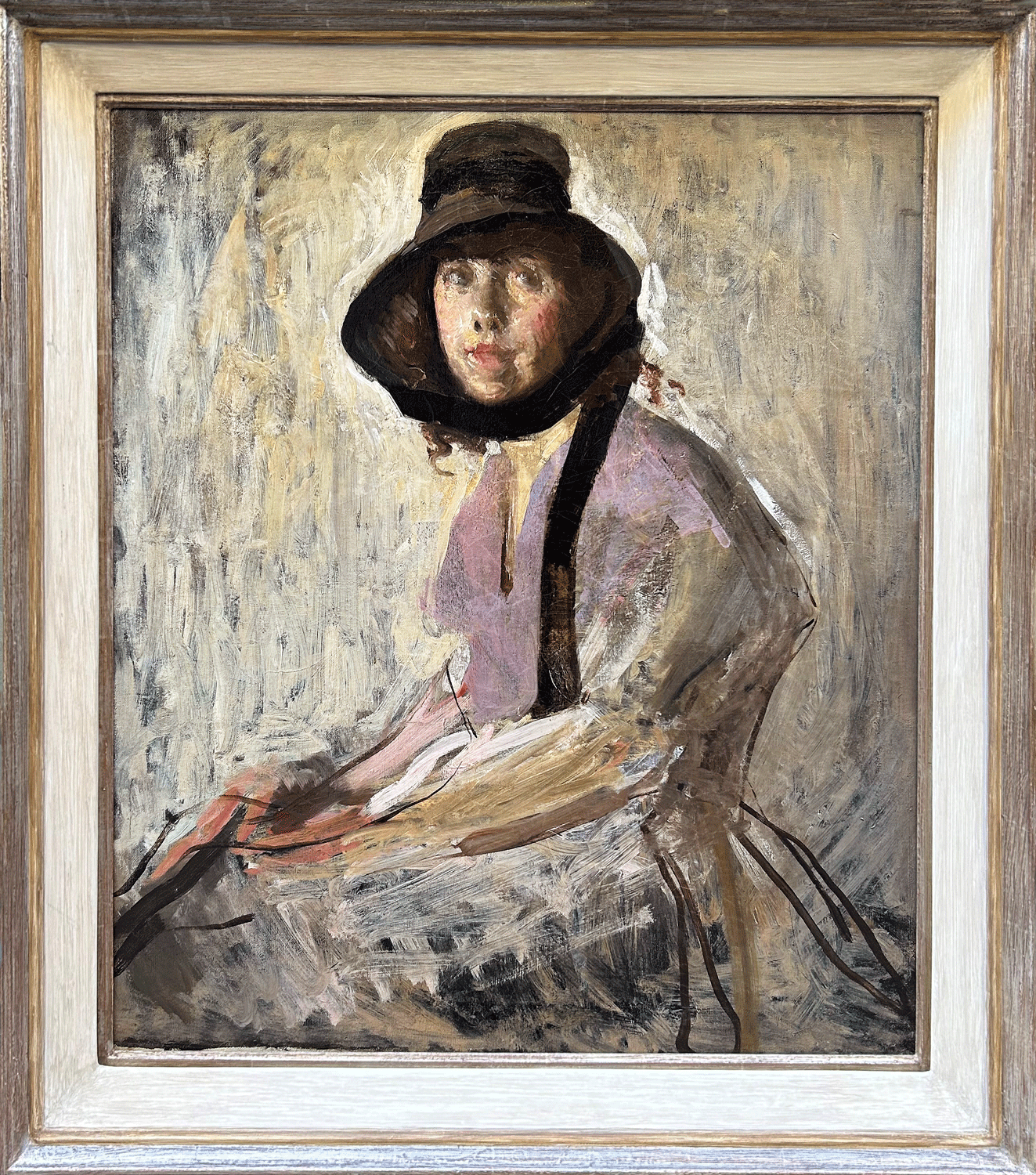 This portrait of a seated woman in a black bonnet. Gestural swathes of paint govern the subject of this portrait. Here, the eyes are the focal point of the work, with the facial features highlighted with delicate attention to detail. Although the sitter is unknown, the artist explores her character through attentive handling and renders her facial expression with curiosity and kindness.