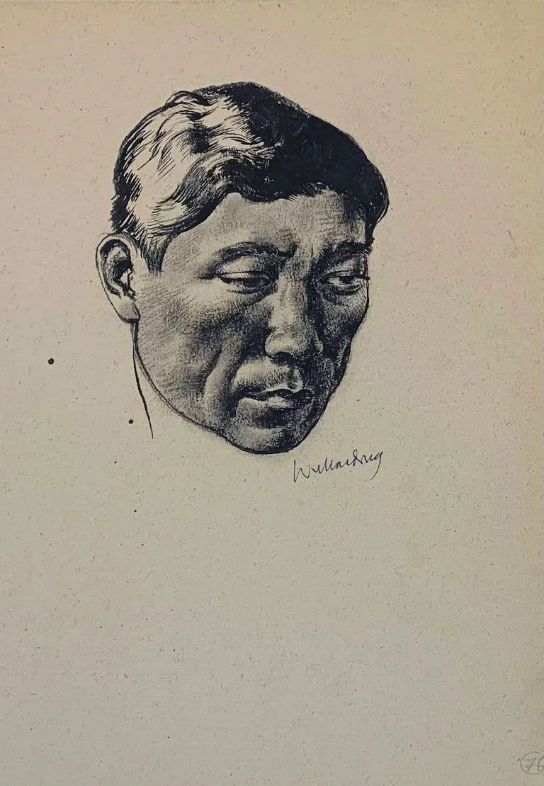 The artwork portrays a mans head study in profile, meticulously rendered in ink on paper. Dring pays close attention to the contours of the skin and hair. The intricate facial details prompt viewers to contemplate themes of identity and expression, while the minimalistic background underscores the figure’s separation from its surroundings.