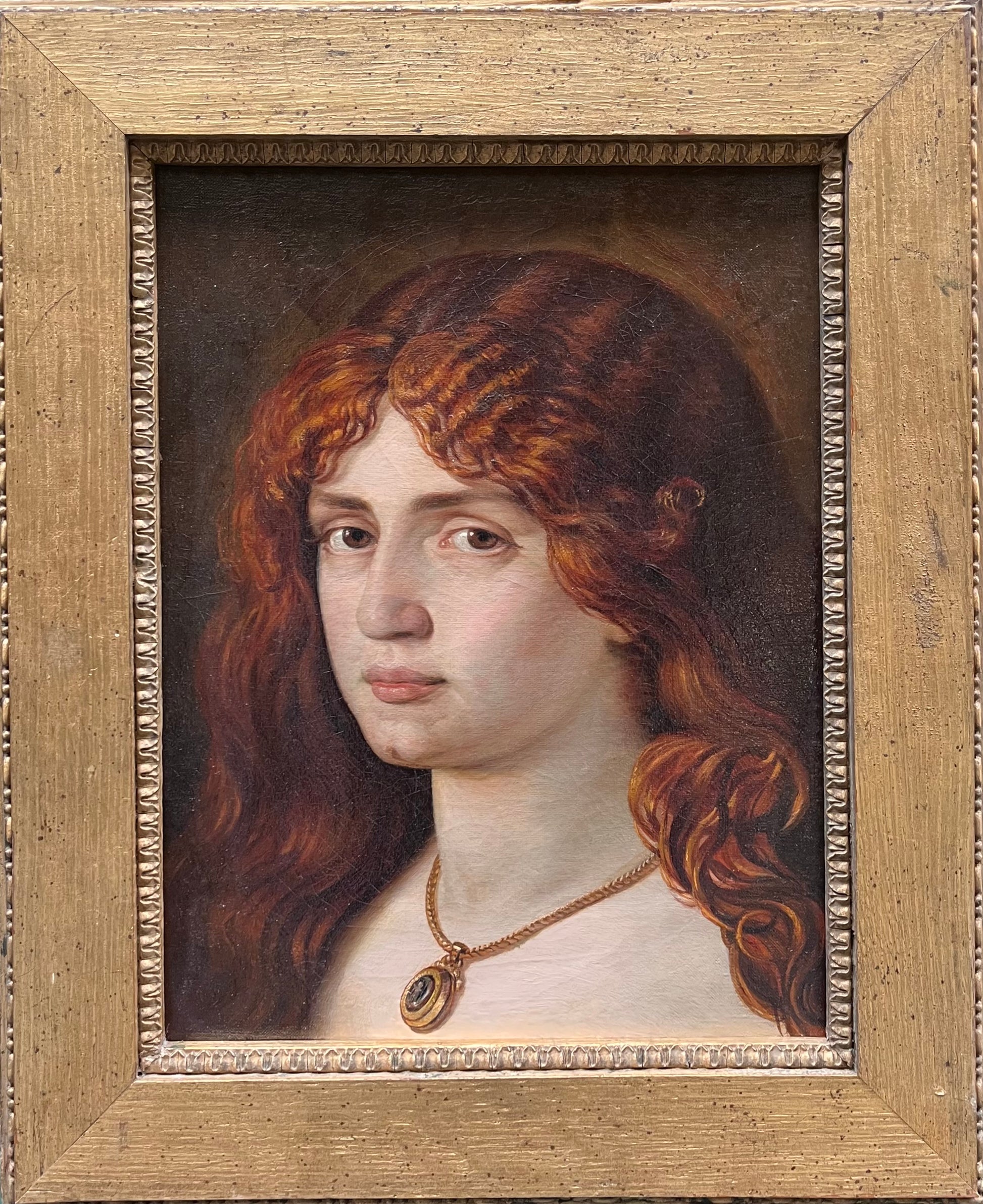 The orange palette of this work is instantly striking - from the lady’s auburn hair to her deep chestnut eyes, to the reddy blush on her cheeks, there is a true sense of warmth to the painting. The lady gazes matches the eye-contact of the viewer without recoiling, but this gesture is more inviting than challenging. Her round face and plump lips connote abundance, as well as the wealth of fiery red curls that cascade from her head, each strand of hair painted in excruciating detail. Her fair skin, rendered so well that it is almost tangible, creates a sense of youthfulness to the sitter. Around the lady’s neck hangs a simple golden chain with a cameo locket, perhaps containing a lock of hair from her lover. The way the light reflects off of the shiny surface of the gold is masterful and demonstrates the artist’s keen eye for the behaviour of light.