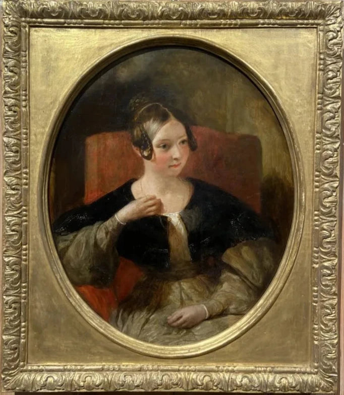 This is a striking and well-executed oval half-length portrait of a girl sitting in an armchair in a brown dress and a black lace scarf. In this work as much attention is paid to the girl's luxurious apparel as her facial features. The fabrics are defined with lightness and dexterity and the clear fresh palette and the striking eyes are exquisite. As she sits her right hand is raised in an absent-minded gesture to hold the delicate strand of the necklace around her neck.