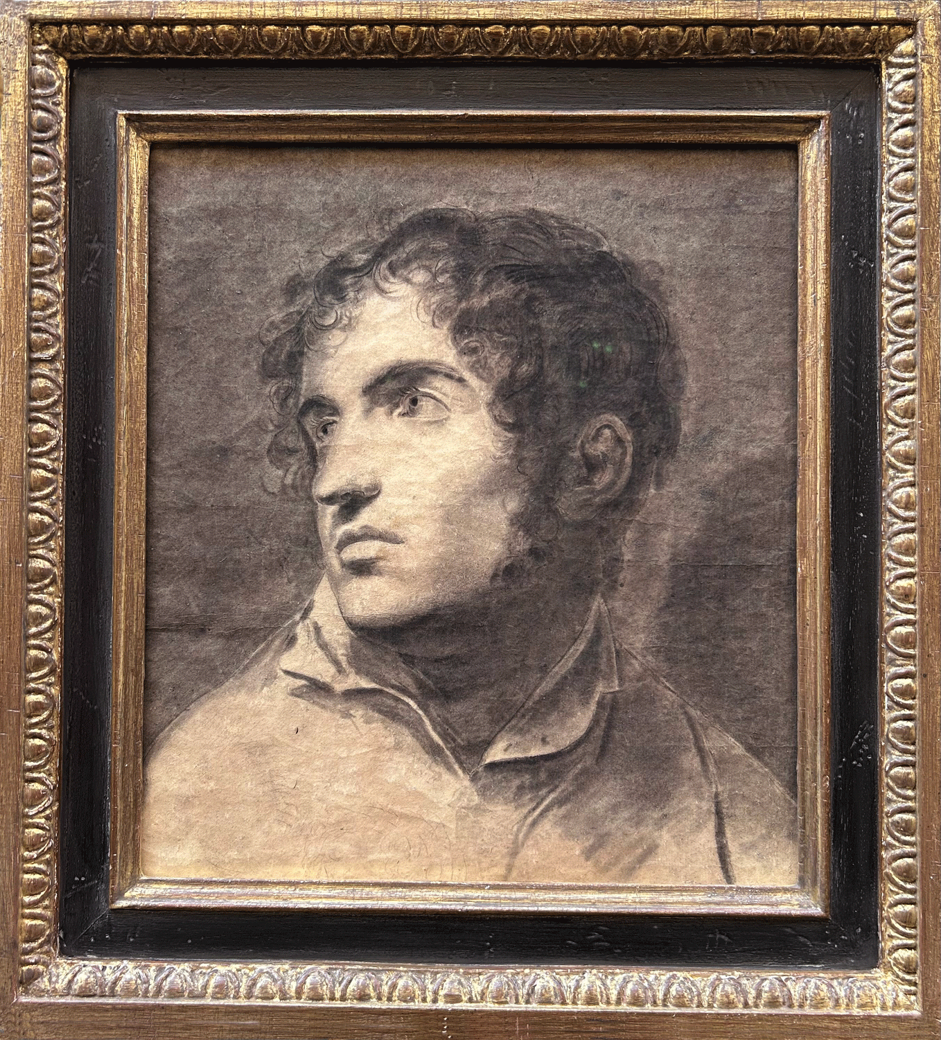 This charcoal portrait depicts a young gentleman with plentiful curly hair and wearing an opened collared shirt. His head is turned right, towards a distinctive light source and he gazes off in this direction.