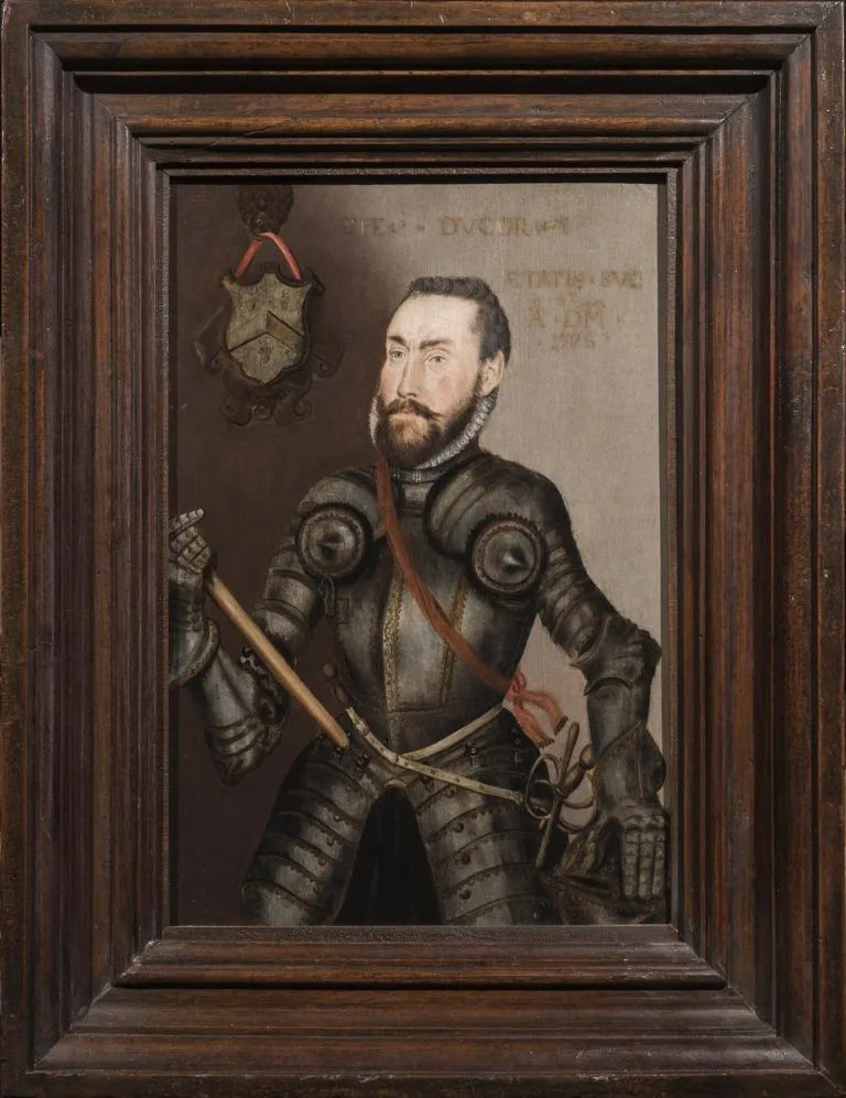This fine and rare three-quarter-length portrait depicts Captain John Hyfield (or Highfield). Born in 1516 John Highfield became the Master of the Ordnance for the garrison at Calais in the reign of Queen Mary and the author of a first-hand account of the French capture of the port in January 1558. Highfield was briefly thought to have been involved in a plot to betray the port to the French besiegers and was arrested on this suspicion by the Duke of Savoy. He evidently seems to have been able to establish his innocence of the charge. He was married by 1558. He had at least one son, John II, and a daughter named Maud whom married into a Norfolk branch of the Copledike family and lived with her husband in Kirby.