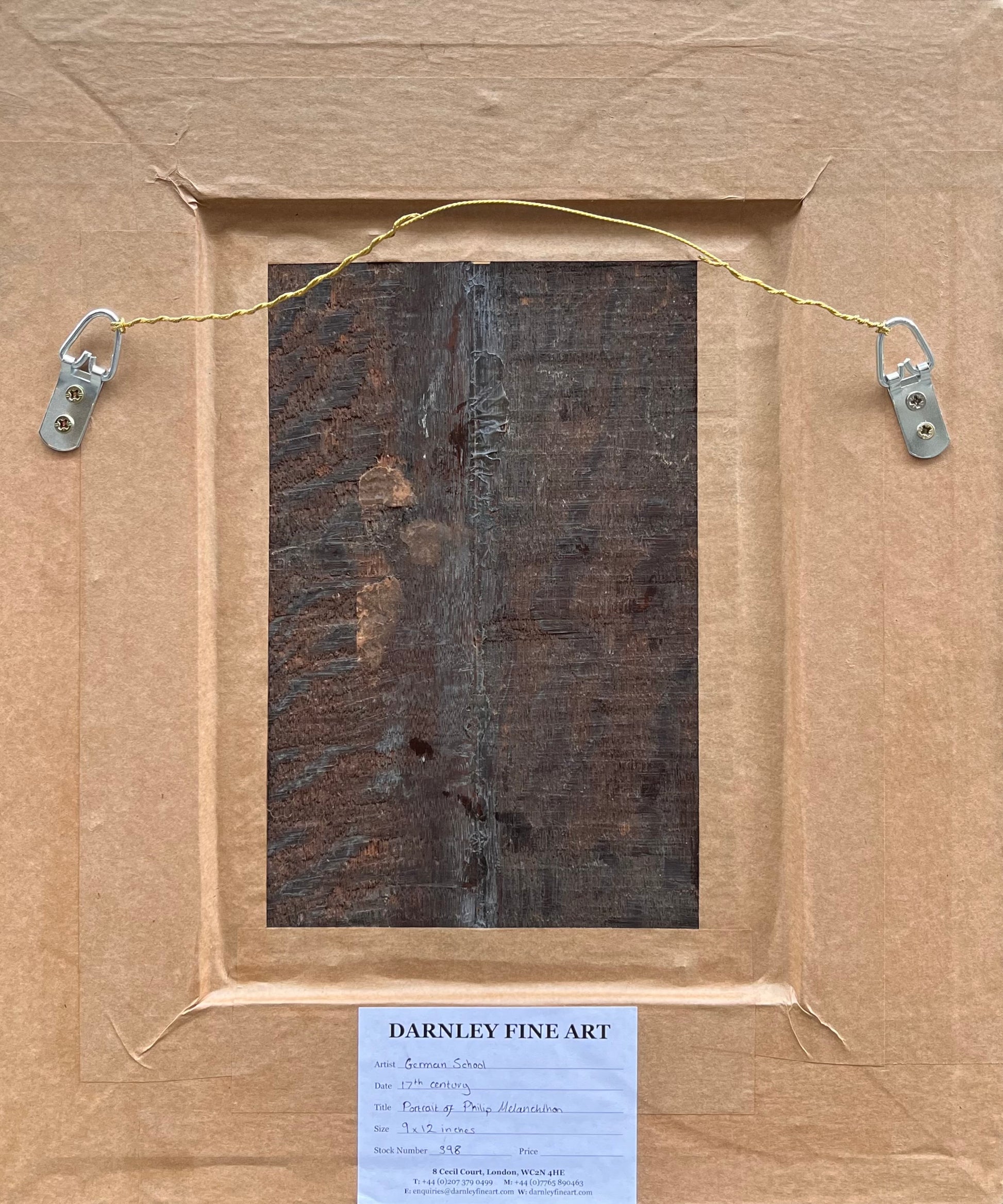 This charming portrait depicts Philip Melanchthon, the acclaimed Lutheran reformer, in the Netherlandish portrait style. Melanchthon is depicted against a humble brown background in his typical black robes, the lack of embellishment or colour reflecting the Protestant ideals of modesty and humility. His face is resolute and his eyes sparkle with life, almost as if the sitter is concentrating or deep in thought.