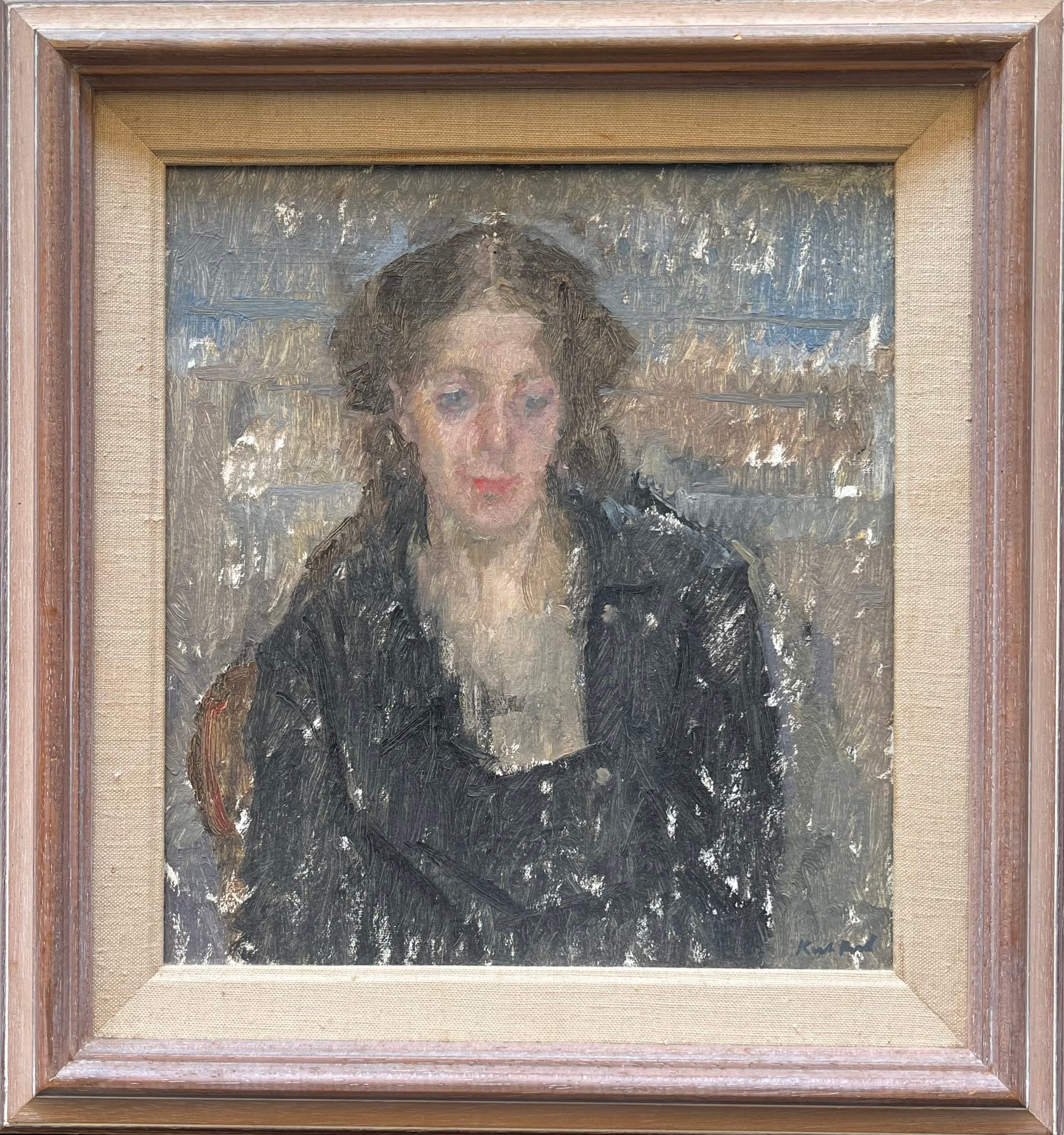 This portrait depicts Kuhfeld’s wife Cathryn as she sits in a chair, wearing a simple black dress. The loose brushstrokes create a sense of spontaneity to the work, as if it has captured a brief moment in the life of the Kuhfelds, and produces a visual haze that lends the painting a memory-like air. The palette is very muted and consists of greys, browns and blacks, drawing attention to the pink of Cathryn’s face and her red lips.