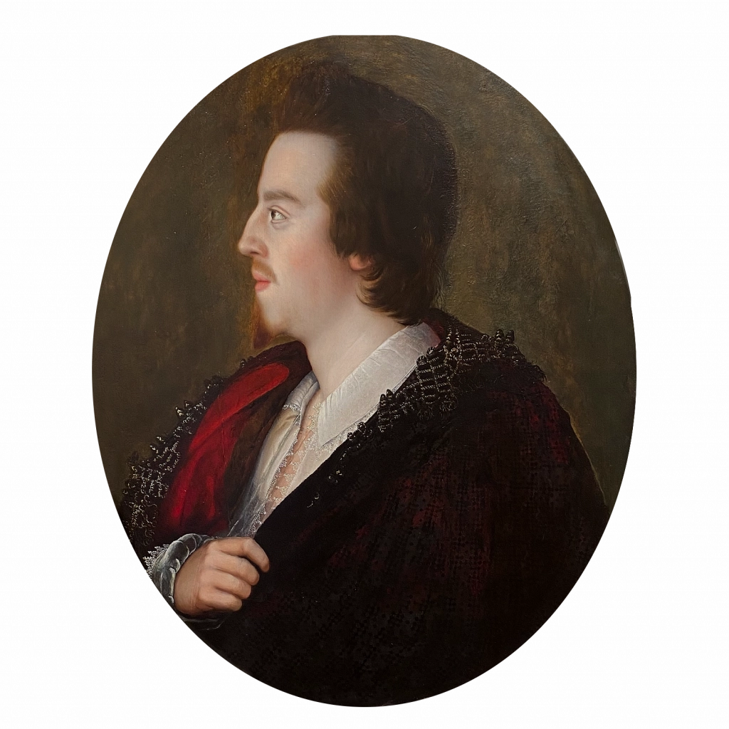 Painted onto wooden panel, this portrait shows a dark haired gentleman in profile sporting an open white shirt. On top of this garments is a richly detailed black cloak, decorated with gold thread and lined with a sumptuous crimson lining. With the red silk inside it’s all very expensive and would fall under sumptuary laws – so this is a nobleman of high degree.