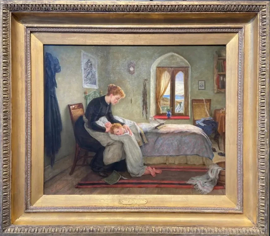 This work has a strong nautical theme as suggested by the title. Through the small window at the back of this interior room we glimpse the sea, seemingly calm and peaceful. Despite its appearance, the threat of sea is reminded to us with the poster over the bed inscribed with the phrase 'Man Overboard'. This is cleverly echoed by the toy sail boat that lies at an angle, tipped to one side on the bedcovers. As we examine this image of boy and mother one can also identify a picture mounted on the wall of a man in a sailors uniform and it becomes clear that the father of the family is currently away from home chancing his fate on the treacherous seas.