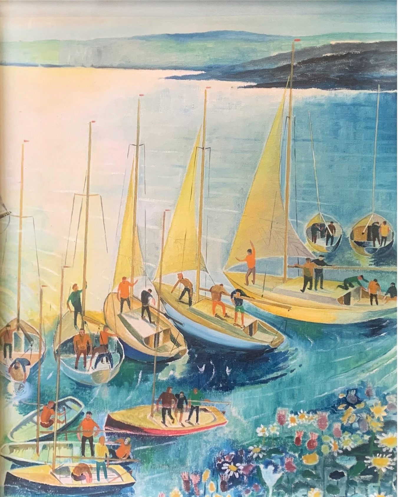 This painting by James captures a serene scene of several yellow sailed boats as they are prepared for a race. While the water reflects the boat's vibrant colours, in the foreground, an array of colourful flowers sets the viewer on a cliff side edge, looking down on the scene. The distant shoreline, complete with rolling hills and a clear, sunny sky, evokes the serene stillness of the summery Plymouth day traditional to James work.